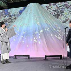 本展は、葛飾北斎や歌川広重といった浮世絵師たちの名作300点以上をもとに、3DCGアニメーションやプロジェクションマッピングなどの最新技術で再現された、体感型のデジタルアートミュージアム。浮世絵の世界へ没入できるイマーシブ形展覧会である本展にちなみ、どっぷり没入したいことを聞かれた野村は「今までも筋トレがすごく好きで、没入していたんですけど、今回の豪の部屋に映し出されていた武者たちがすごくムキムキで、“漢”って感じの人がたくさんいたので、それを見てもっと僕も筋トレ頑張ってたくましい男になりたいなと思いましたね」と目を輝かせ、自信のある筋肉を問われると「肩ですね。1番力を入れている部位なんですけど、肩幅が広い男性はすてきだなと思っているので、肩幅を広くしようと肩と背中を鍛えるようにしています」と明かした。野村康太、松本まりかとの出会いに感謝
