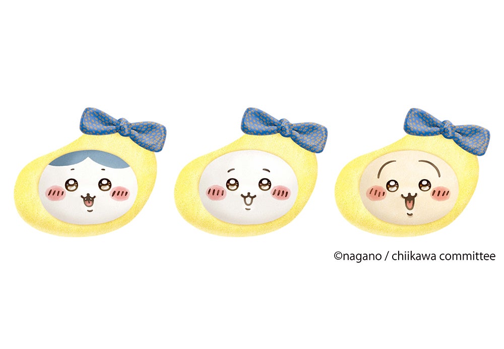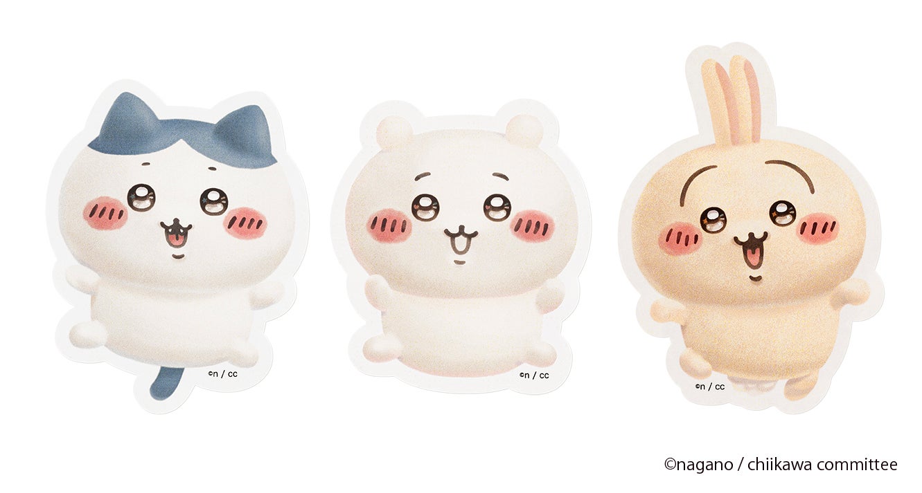 「ちいかわ」と「東京ばな奈」のコラボレーション感あふれる、特別なオリジナルデザインも。「ちいかわたちと目が合う」ことを大切にし、キラキラした瞳のちいかわを表現。「東京ばな奈」のスポンジ生地のようなふわふわなタッチのちいかわたちもポイントとなっている。お菓子の個包装にはリボンのついた東京ばな奈のかぶりものをしたちいかわたちをデザイン。「ちいかわ」「ハチワレ」「うさぎ」の何が出るかは開けてみるまでわからない。8個入パッケージには、「ちいかわ」「ハチワレ」「うさぎ」のオリジナルステッカーがランダムで1枚入っている(※4個入にはオリジナルステッカーはつかない)。