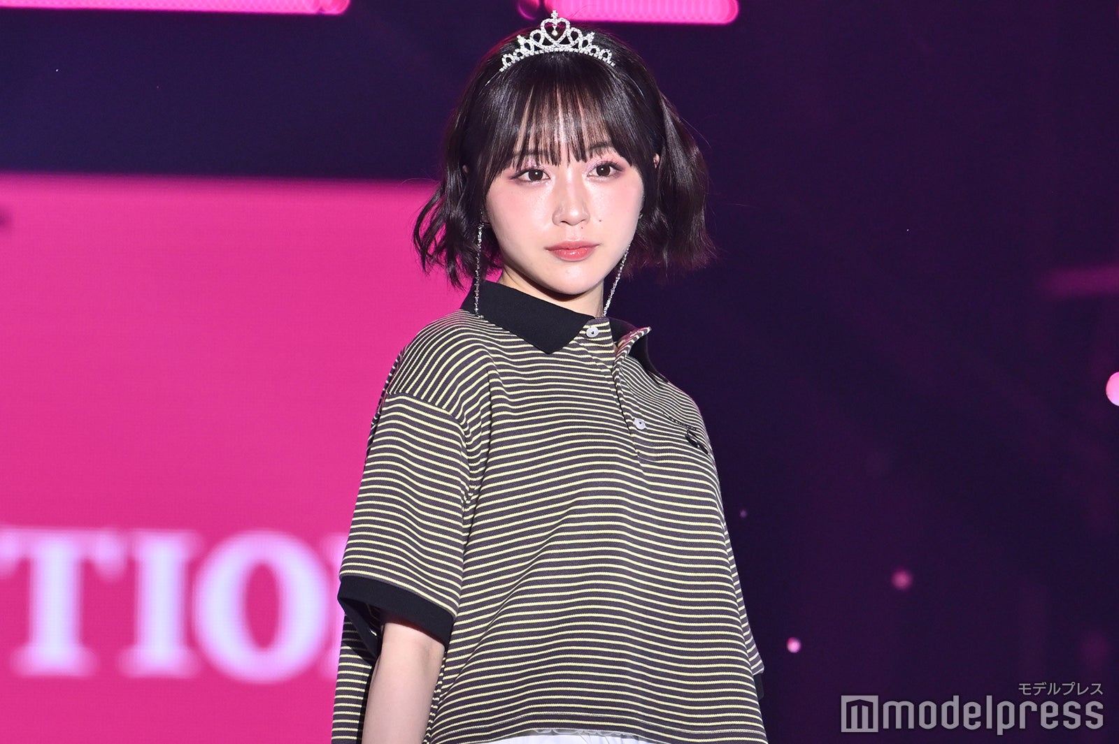 ゆるっとしたシルエットが可愛らしいボーダーのポロシャツで爽やかな雰囲気をまとったなえなの。ボトムスにはスポーティなラインパンツにフリルのスカートを合わせトレンドのスタイリングを着こなしていた。「TGC」20周年 テーマは「HERE WE GO!」