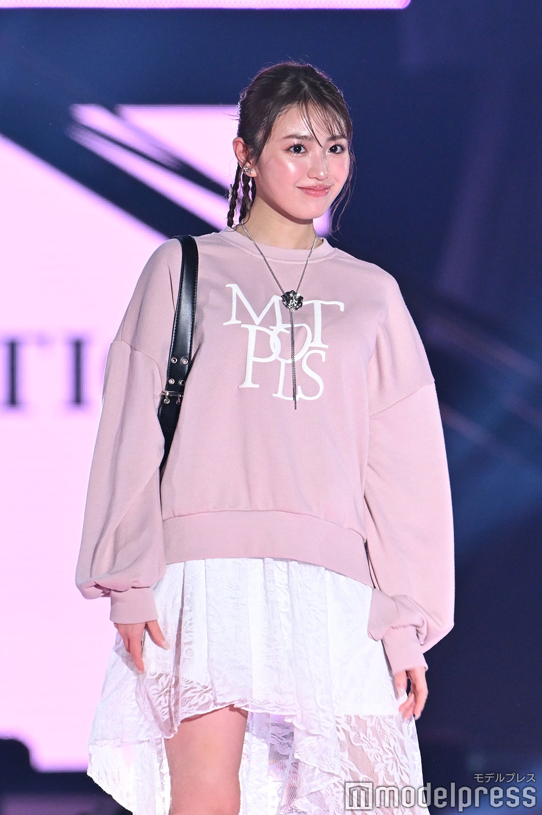 ピンクのスウェットの春らしい柔らかいコーディネートで登場した香音。美しい脚が際立つレースのミニスカートを合わせた。「TGC」20周年 テーマは「HERE WE GO!」
