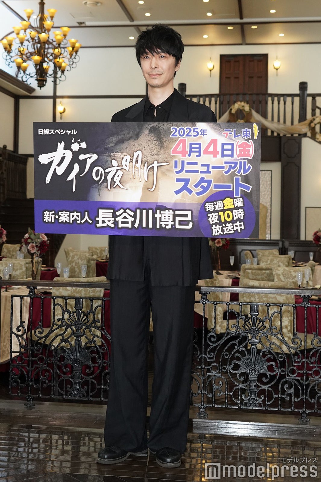 23年放送してきた「日経スペシャル ガイアの夜明け」は4月4日の放送からリニューアルを果たし、番組の顔となる「新案内人」に長谷川を起用。長谷川は毎回のテーマに応じたドキュメンタリーの多面的な見方や内容に深みを与える“語り部”を担当。初代の役所広司と同じく本格的寸劇を交え、七変化するミステリアスなキャラクターとなる。1回完結型の同番組において長谷川のパートは連続するオリジナルストーリーとして広く楽しめる。報道陣の前に姿を現した長谷川は「このような歴史のあるすてきな番組の新案内人に配役されましてたいへん名誉に考えています」と目を輝かせた。「毎週ある番組にこうやって出ることは初めて」と話し、「どこまでできるかわかりませんが、ワンクールとかで降ろされないようにきちんと一生懸命やりたいと思っています」とジョークを交えて挨拶し、会場を盛り上げた。