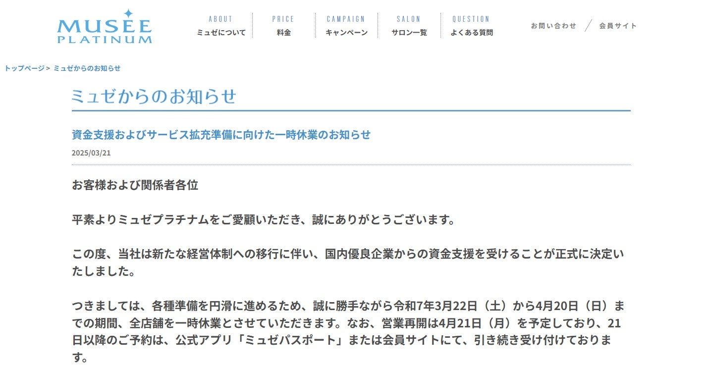 脱毛サロン「ミュゼプラチナム」一時休業発表 新たな経営体制へ移行「各種準備を円滑に進めるため」