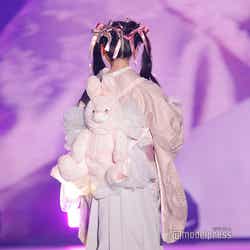 雑誌「LARME」のステージに登場した松本は、淡いピンク色の袴姿でランウェイ。頭上でうさぎポーズを披露し、会場は悶絶していた。その後のトークでは「LARMEならではの配色と、あまり袴でうさぎを羽織ったりしないと思うんですけど、今日はうさぎちゃんも連れてきたので、それがポイントです!」と背負っている大きなうさぎを紹介していた。