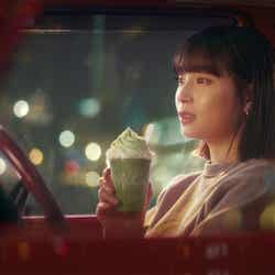 撮影が順調に進み“姉妹”として息もピッタリ合ってきた頃、宮崎と広瀬はフラッペを飲むシーンに挑戦。宮崎は甘酸っぱさが楽しめる「いちご練乳フラッペ」、広瀬は抹茶の芳醇な風味が感じられる「宇治抹茶フラッペ」を調理担当のスタッフから受け取り、ここでも仲のいい姉妹らしく動きをピッタリ合わせて、それぞれ手に持ったフラッペを味わう。監督がOKの合図を出すと、宮崎は「おいしい! シャリシャリした食感がいいね~」と「いちご練乳フラッペ」の感想をポツリ。広瀬も「おいしいですよね~」と「宇治抹茶フラッペ」を飲みながら、車の中でカフェタイムをエンジョイしていた。
