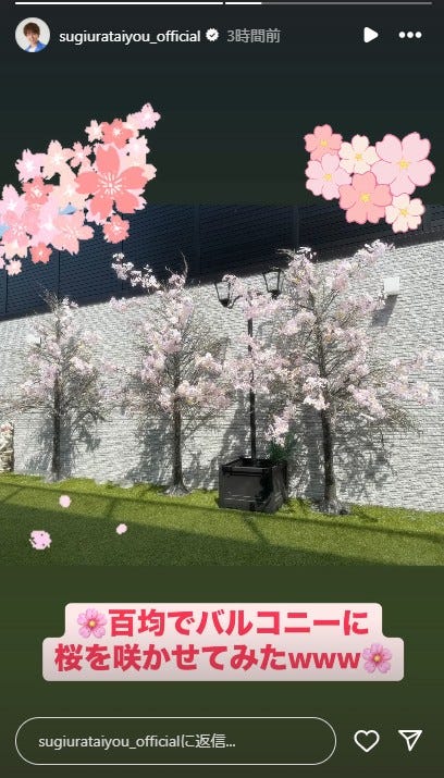杉浦太陽「桜を咲かせてみた」豪華な自宅バルコニー公開「アイディアがすごい」「公園みたい」と反響