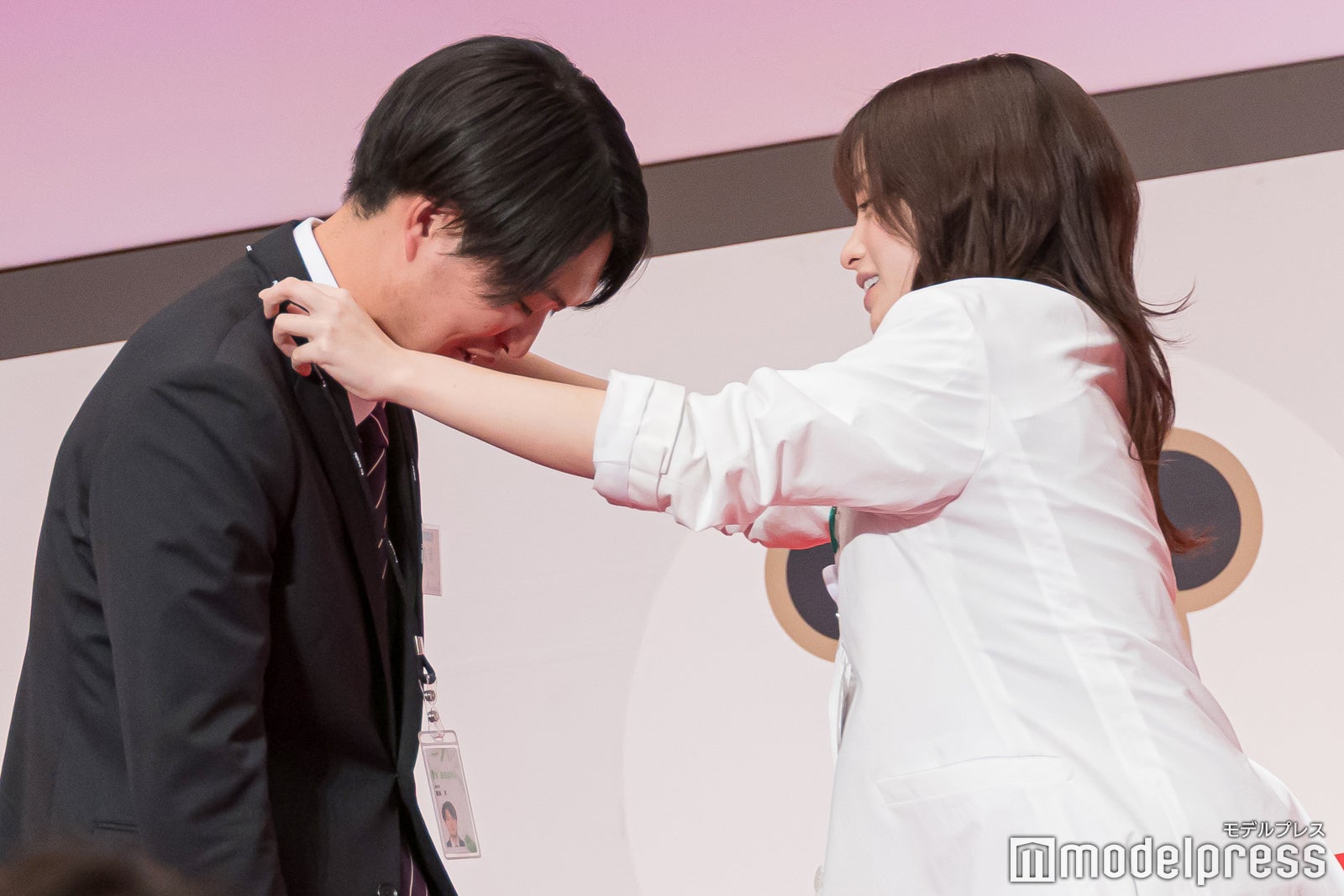 4月22日よりスタートする同局系ドラマ『天久鷹央の推理カルテ』(毎週火曜よる9時~※初回は拡大スペシャル)で主演を務める橋本が劇中の白衣姿でサプライズ登場すると、会場からは大きな拍手が。橋本は「このまま出てきました(笑)」と笑顔を見せていた。お題に対する新入社員の回答をくじで引き、ともに軽妙なトークで入社式を盛り上げた橋本。その後、新入社員一人ひとりの首に、橋本の手で社員証を掛けることに。すると、女性の新入社員から何かを伝えられ、「え!」と驚く橋本。「同じ実家!同じマンション!」「えー!びっくりした」と目を丸くし、社員証の贈呈を終えた後も「衝撃が忘れられなくて」とつぶやいていた。