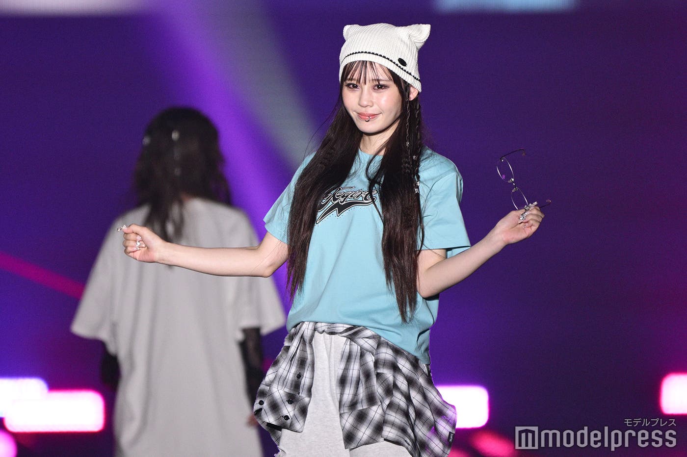 村川はブルーの半袖シャツにダメージパンツ、チャックのシャツをあわせたコーディネートで登場。トレンドの猫耳ニット帽とメガネをアクセントにし、ランウェイトップではメガネを外してキュートに猫の手で“にゃん”とキュートにポーズを決めた。「TGC熊本2025」テーマは「Blooming Together」