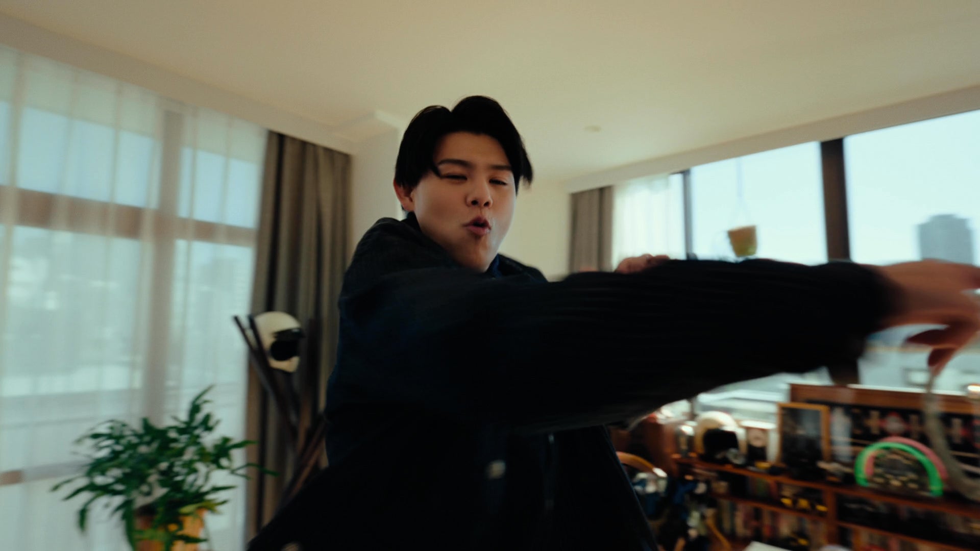 CM出演が決まった喜びをダンスで表現するシーン。振り付けの先生とともに振り入れに励んでいたLEOは、「こんなに早く振り付けを覚えて、実践するのは初めてです」とやや不安げな様子であったが、驚くほどのスピードで習得し、「しゃーっ行きます!気張っていこう!」と自らに気合いを入れ、本番に臨んだ。