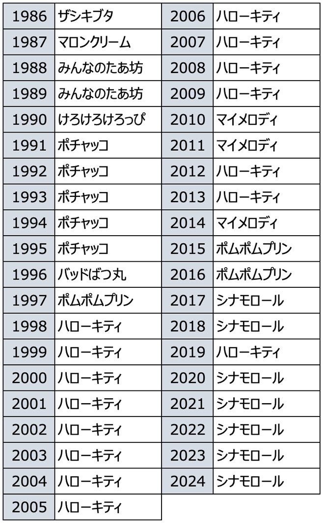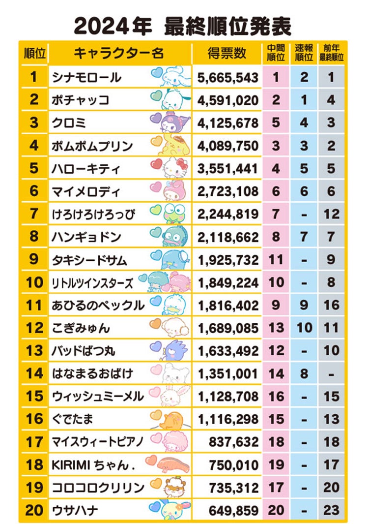 今回8位にランクインしたのは、昨年初エントリーにも関わらず最終結果14位をマークした「はなまるおばけ」。TOP10のニューカマー登場となるのか。さらに上位常連キャラクターである「ハローキティ」や、今年アニバーサリーイヤーを迎えている、50周年の「マイメロディ」と「リトルツインスターズ」、40周年の「ハンギョドン」、 20周年の「クロミ」も好調な滑り出しを見せた。
