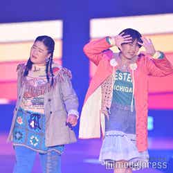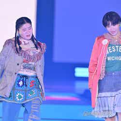 サステナブルをテーマとした「Think about Sustainable!!」のステージにシークレットゲストとして登場したガンバレルーヤ。よしこは、グレンチェックのジャケットに、ボトムスには編みニットとブルーのパンツを合わせたスタイルで登場。まひるは、ピンクのアウターに緑のトップス、デニムと柄の異素材MIXスカートをあわせてコーディネートをまとめた。ランウェイトップでは、華麗にウィンクを決めたあと、よしこの上にまひるが乗っかる大技を披露し、会場を驚かせていた。