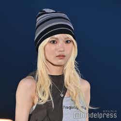 鶴屋はウエストラインをちらりと見せミニ丈のタンクトップに変形のベストをレイヤード。ボーダーのビーニーとサングラスでクールな印象を与えた。ランウェイトップではサングラスを外し、微笑みを浮かべていた。「ガルアワ2025 S/S」テーマは「Play Your Style −8bit Dreams−」