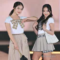 愛はラブリーな黄色のリボンのついたトップスにベージュのロングスカート、天音は黒のリボンがついた色違いのトップスに美しい脚が際立つベージュのミニ丈スカートを合わせて登場。シミラールックで仲良くランウェイを歩き、キュートにポーズを決めていた。「ガルアワ2025 S/S」テーマは「Play Your Style −8bit Dreams−」