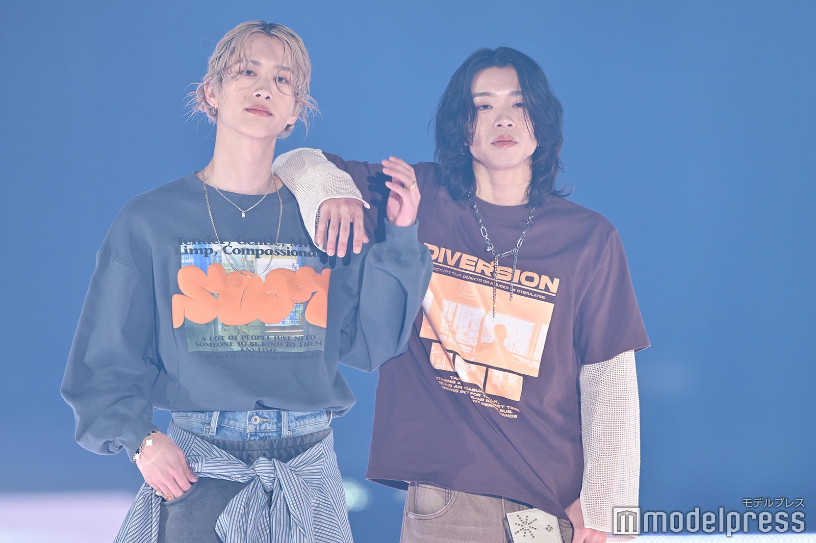 もーりーはグレー系、しゅーとはブラウン系とカジュアルなコーディネートで登場した2人。1回目のランウェイでは、もーりーがしゅーとの肩に手を置いたポージングだったが、今回はしゅーとがもーりの肩に手を置くポーズに。さらにもーりーがしゅーとの腕に手を寄せ、引き寄せる仕草に一際歓声が上がっていた。「ガルアワ2025 S/S」テーマは「Play Your Style −8bit Dreams−」