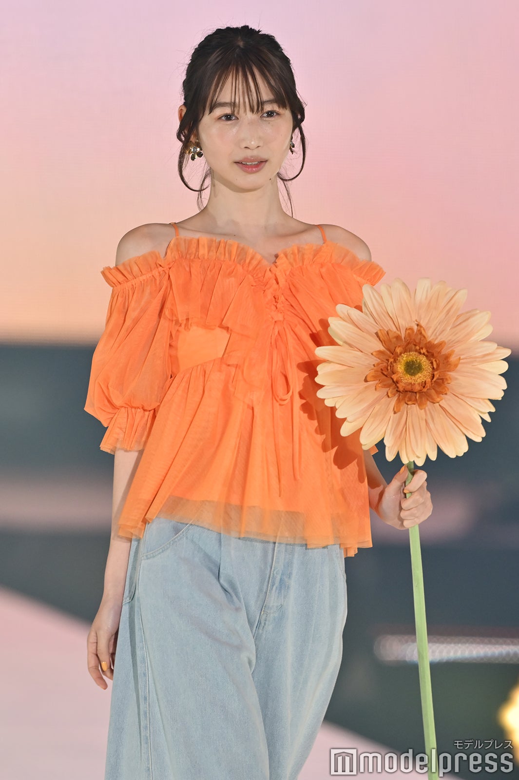 「おむすび」で話題・岡本夏美、肩出しトップスから美デコルテ披露 オレンジで統一感【GirlsAward 2025SS】