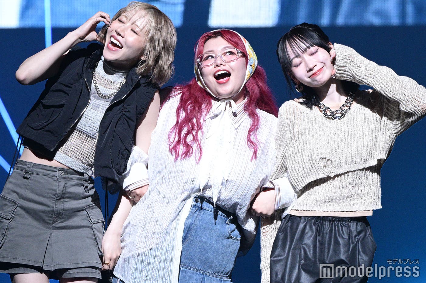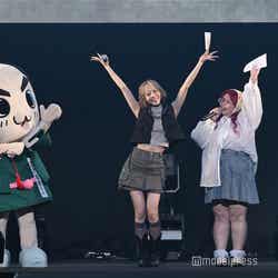 エアはノースリーブ姿、UraNはバブーシュカを取り入れ、浅見めいはショート丈トップスを着こなして登場。トップでは腕を組み、ハートポーズで顔を寄せ合って観客を沸かせた。「TGC香川2025」テーマは「Frontier」