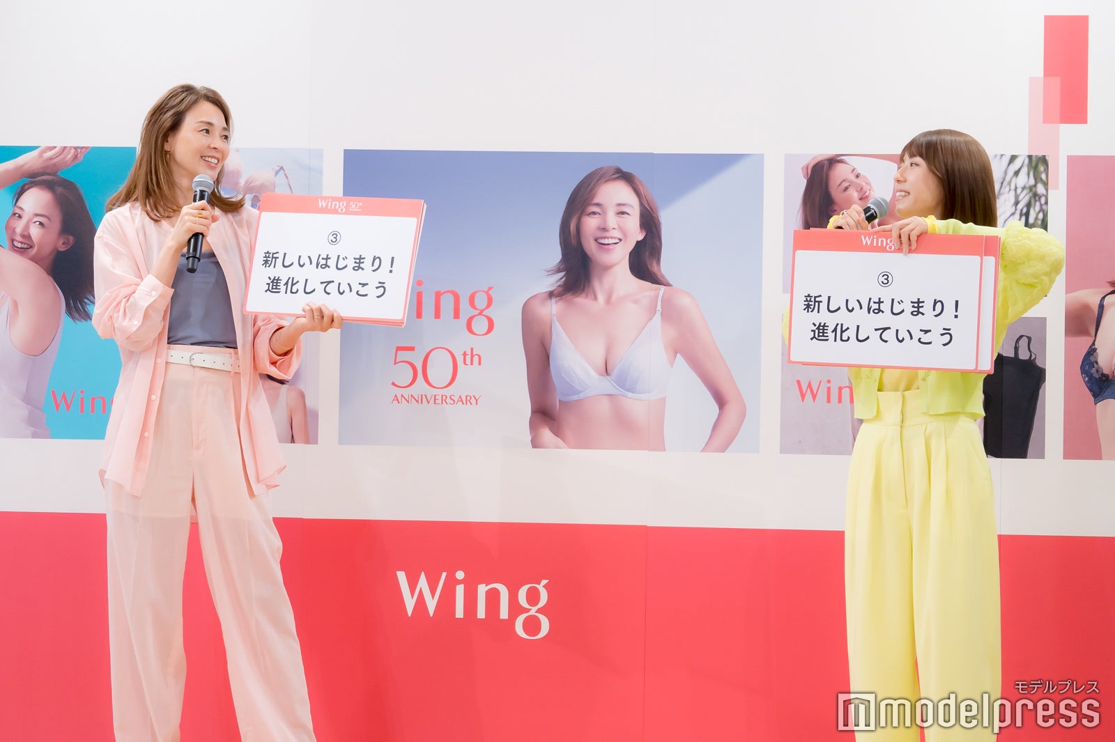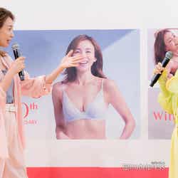 SHIHOは約20年ぶりに「ウイング」のイメージキャラクターに就任。特別ゲストとして登壇した若槻は「初めましてなんです。本物に会えるのが。20年前のCMも見てるので、めちゃくちゃうれしいです!『こんなに人って変わらないんだ『っていう。夢のようです、本当に」とSHIHOとの対面に感激していた。発表会では、約20年前のSHIHOのポスターが登場。若槻は「このまま!変わらないです」と驚きの表情を見せた。美しさのためにしていることを聞かれると、SHIHOは「もちろん何もしていないわけではなくて、その年齢の変化に合わせて、努力を更新しています」と明かし「30歳になるときは運動を始めました。40歳になるときは食事を見直しました。今は50歳を前にしてトレーニングをめちゃくちゃやっています。専門的な先生をつけて、トレーニングにハマってます」と体型維持の方法を語った。