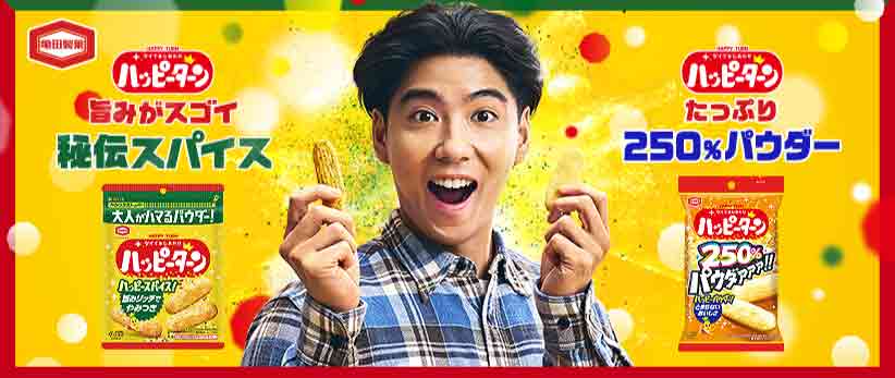 俳優の賀来賢人が出演する亀田製菓『ハッピーターン スパイス』『パウダー250%ハッピーターン』の新CM『ハッピーターンスパイス 旨味篇』、『ハッピーターン250%パウダー 楽屋篇』が、20日より全国公開される。