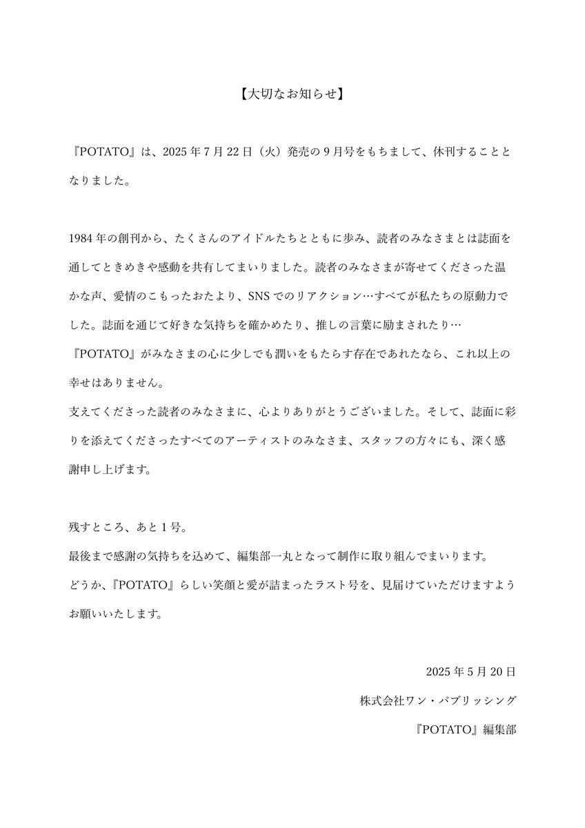 「POTATO」編集部は、公式Xで投稿した書面にて「2025年7月22日(火)発売の9月号をもちまして、休刊することとなりました」と発表。「1984年の創刊から、たくさんのアイドルたちとともに歩み、読者のみなさまとは誌面を通してときめきや感動を共有してまいりました。読者のみなさまが寄せてくださった温かな声、愛情のこもったおたより、SNSでのリアクション・・・すべてが私たちの原動力でした」とし、読者や誌面に登場したアーティスト、スタッフらに感謝を伝えた。そして「最後まで感謝の気持ちを込めて、編集部一丸となって制作に取り組んでまいります。 どうか、『POTATO』らしい笑顔と愛が詰まったラスト号を、見届けていただけますようお願いいたします」と呼びかけている。