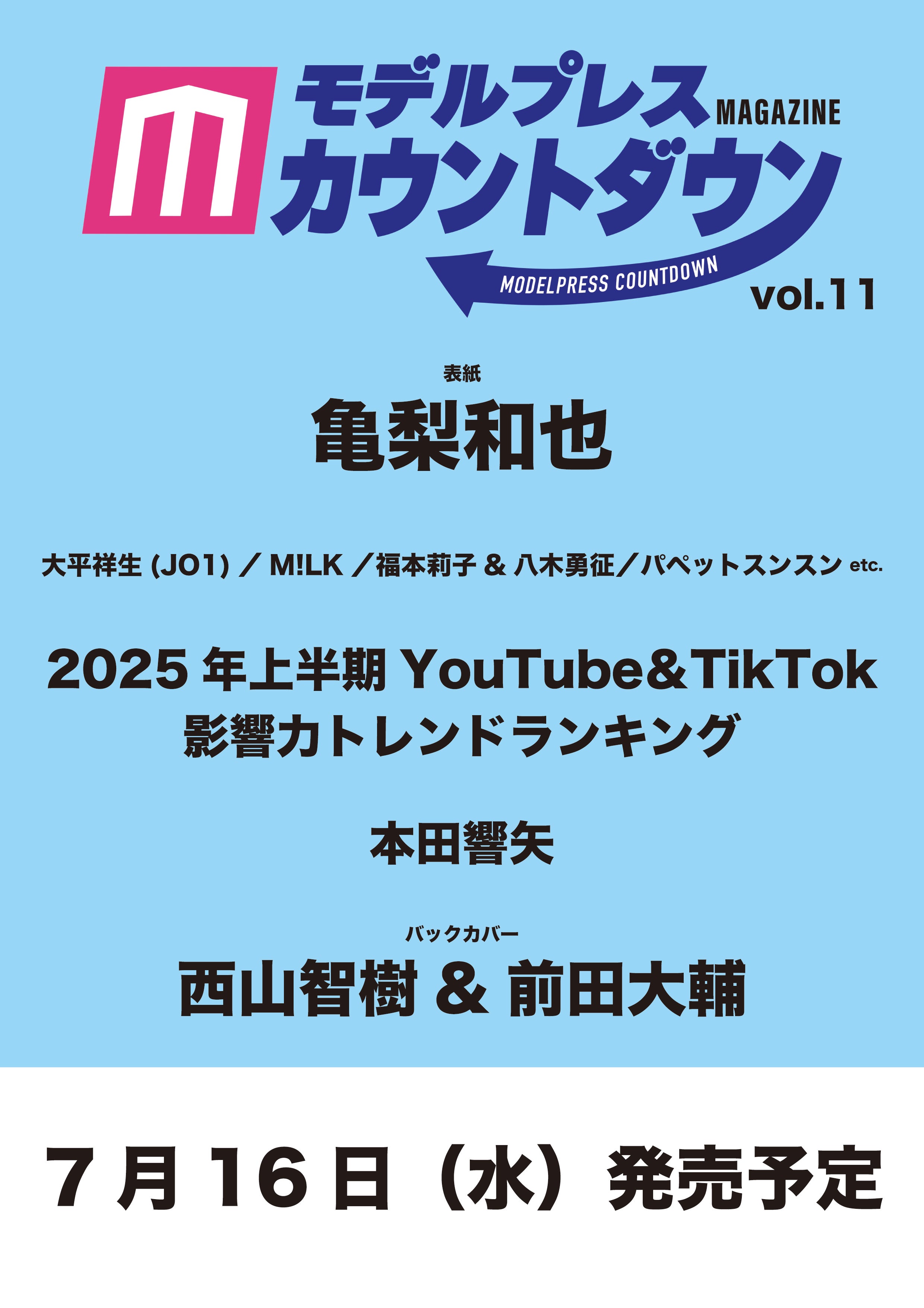 YouTube・TikTokを中心としたアーティスト、クリエイター、インフルエンサーの影響力に着目した雑誌「モデルプレスカウントダウンマガジン」。表紙・巻頭特集にはTVの新番組や自身のYouTubeチャンネルが話題の亀梨が登場。また、クリエイターの影響力をランキング化した「2025年上半期YouTube・TikTok影響力トレンドランキングTOP30」を発表。芸能人、お笑い芸人、VTuber、ゲーム配信、カップル・夫婦系、美容系といったジャンル別ランキングでは、各分野のトレンドクリエイターを解説。さらに、本田響矢、JO1の大平祥生、M!LK、福本莉子&FANTASTICS八木勇征らのスペシャルグラビア&インタビューをお届け。そのほか、5周年を迎えたOWV、TVアニメ「おそ松さん」声優の中村悠一&小野大輔、SNS総フォロワー200万人超の人気キャラクター・パペットスンスン、「エガちゃんねる」ブリーフ団らが、話題のトピックについて語る。バックカバー・巻末特集には新グループ結成で話題の西山智樹&前田大輔が登場する。(modelpress編集部)