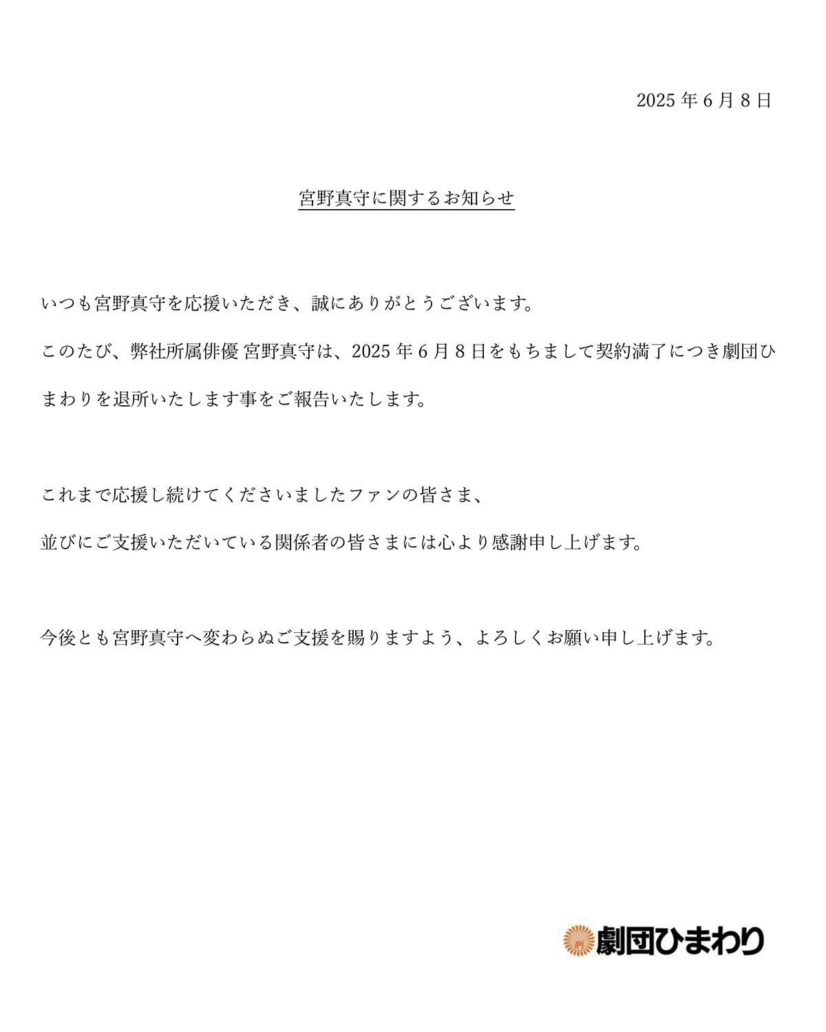 いつも宮野真守を応援いただき、誠にありがとうございます。このたび、弊社所属俳優 宮野真守は、2025年6月8日をもちまして契約満了につき劇団ひまわりを退所いたします事をご報告いたします。これまで応援し続けてくださいましたファンの皆さま、並びにご支援いただいている関係者の皆さまには心より感謝申し上げます。今後とも宮野真守へ変わらぬご支援を賜りますよう、よろしくお願い申し上げます。