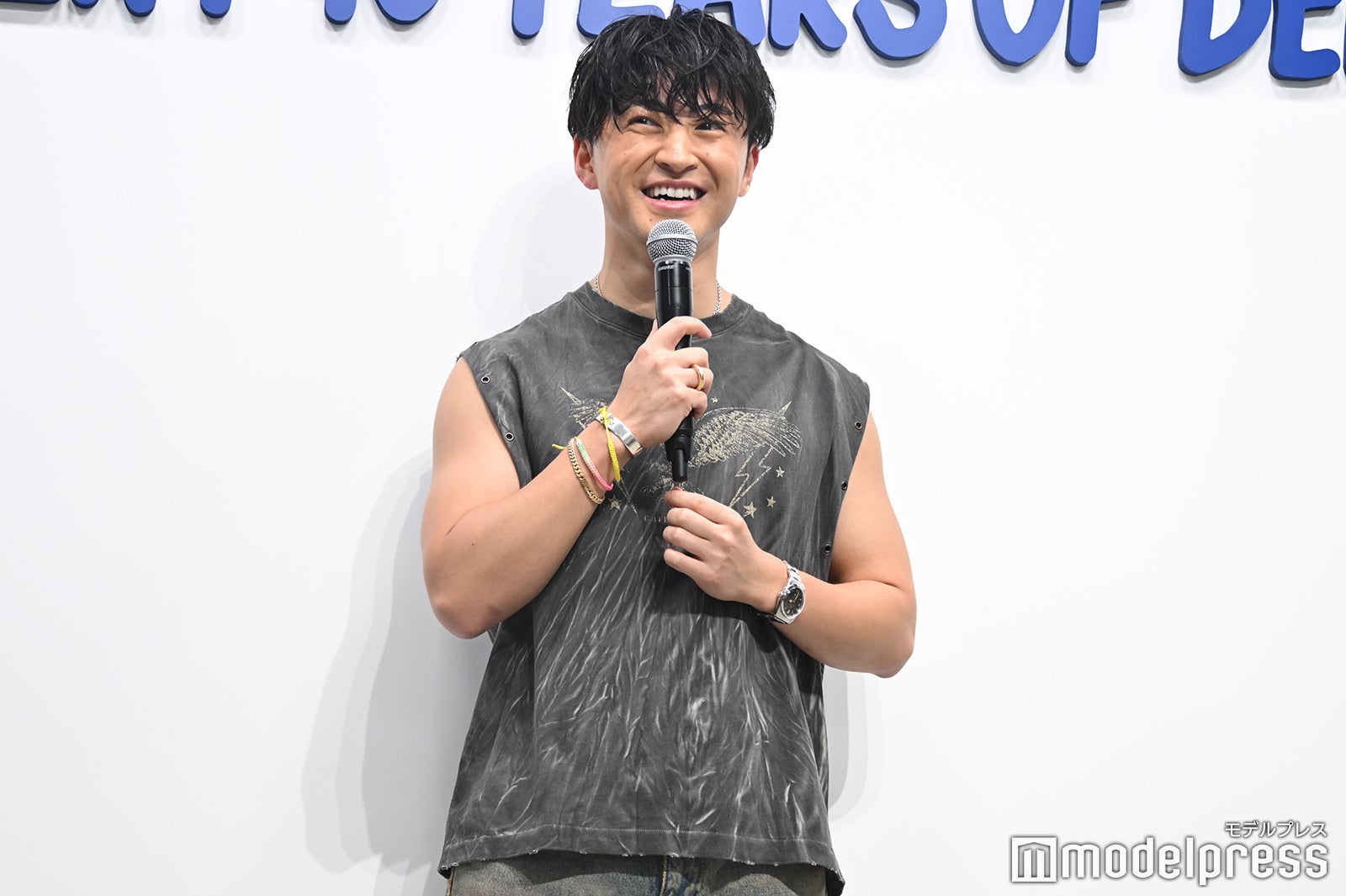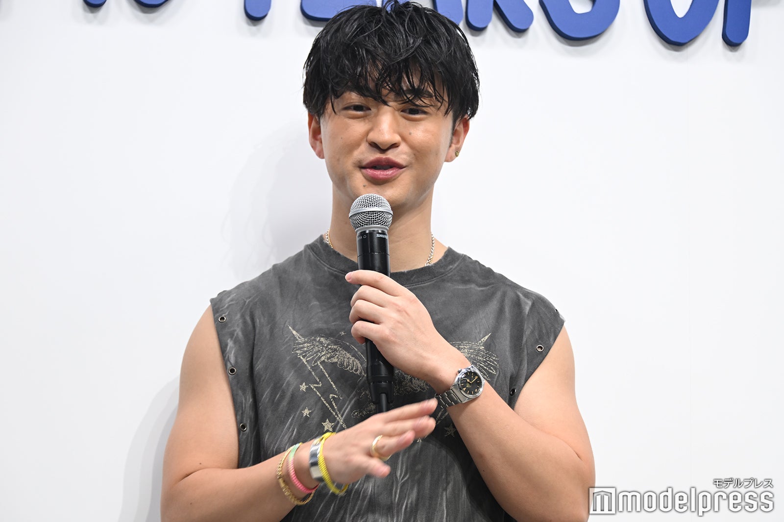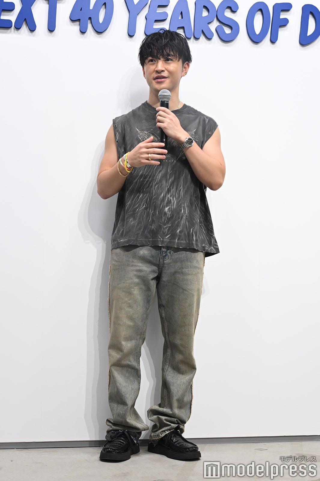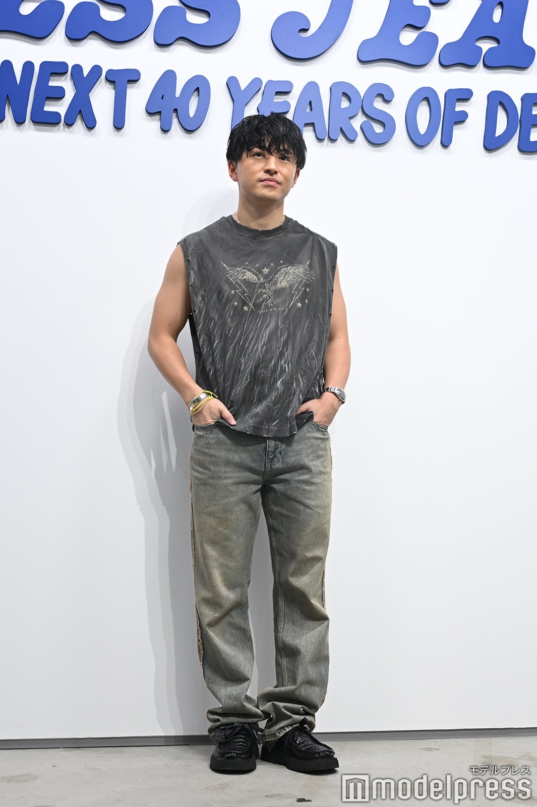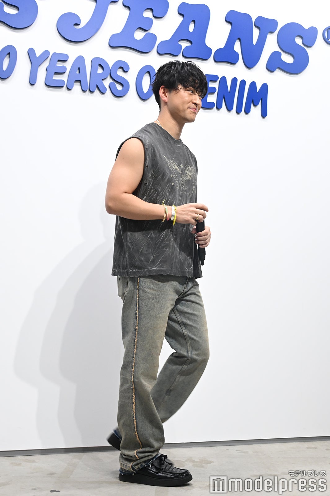 韓国俳優のパク・ソジュン(Park Seo Jun)、韓国のラッパー・音楽プロデューサーのZICO(ジコ)に続き、鍛え上げられた二の腕が際立つノースリーブTシャツとダメージの効いたグレーデニムでフォトコールに登壇した佐野。それまではMCが通訳も同時に行っていたため、冒頭には「日本語喋れます」と報道陣に呼びかけ、笑いを誘った。本展示を観た感想を聞かれると「とても丁寧に職人さんが説明してくださったので、ますます魅力を感じて着るの楽しみだなと思いました」と感銘を受けた様子。この日のファッションのポイントは「西海岸のテイスト。結構加工とかもすごく入ってて、自分はすごくそういったものが好きなので、普遍的なものが好きなので、夏っぽいスタイリングを着てみました」と話していた。