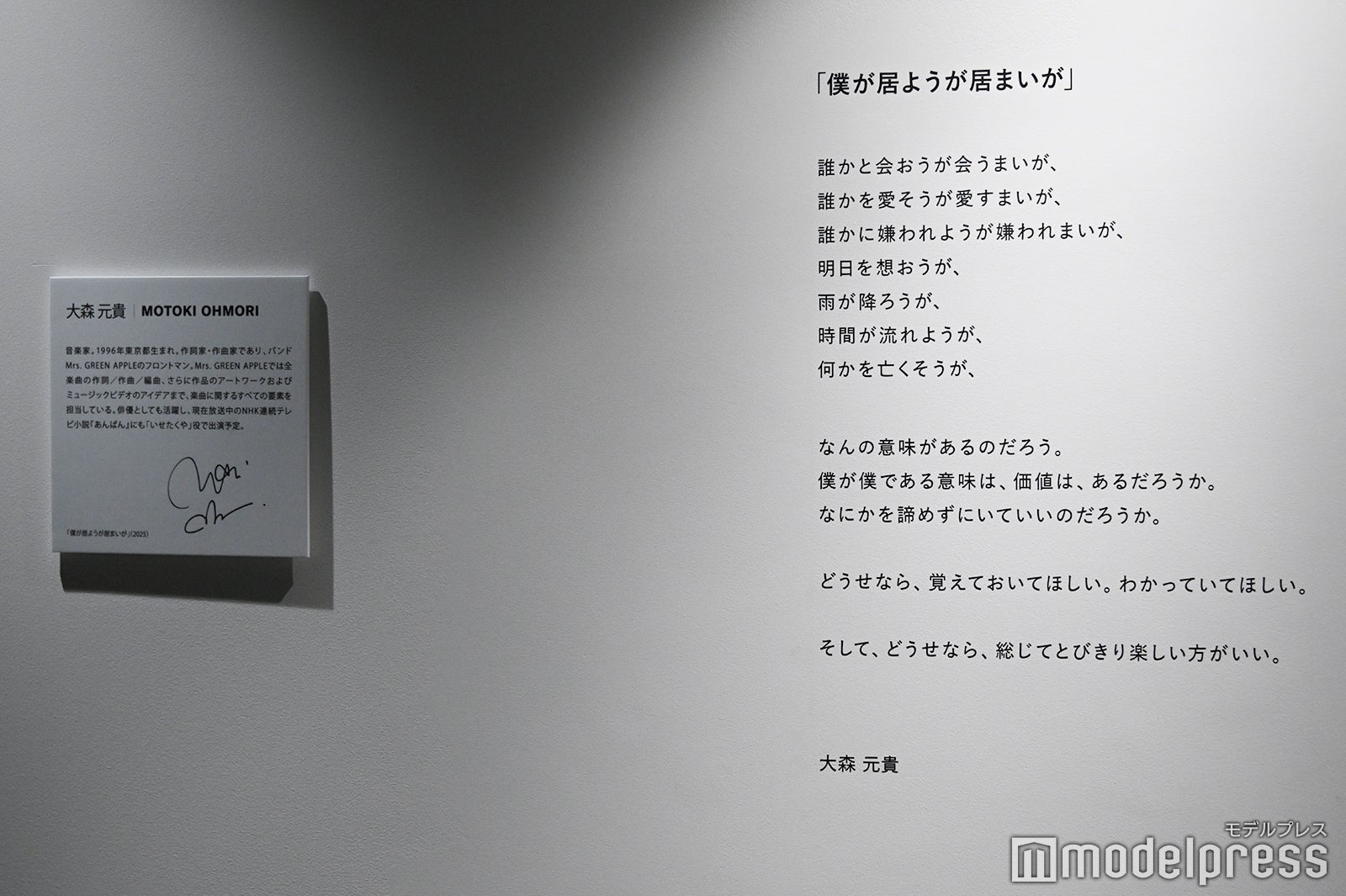Ginza Sony Parkでは受賞者による作品展示会「GQ JAPAN クリエイティブ・ウィークエンド」を開催され、大森は写真作品群《僕が居ようが居まいが》を展示。何気ない街の風景からソファーに置かれたギター、バンドメンバー3人の後ろ姿など、ジャンルを横断して創作を続ける大森の思考と感性の原点をたどり、創作の本質に迫る内容となっている。「日頃音楽を作っているし、人前で歌を歌う表現をするということを生業にしているので、自分の自己表現みたいなものだったり、自分自身と対峙する機会というのがやっぱすごく多い」と表現者として自分と向き合い続けてきたという大森。その中で「結局1人の人間として『自分はどれほど自分自身を認めてあげられるか、今生きている中で僕はどれだけの影響をちゃんと正しく、それは数じゃなくて自分の誠意としてどれだけ残していけているんだろうか』みたいなことを思った時に、やっぱり『0を1回彷彿とさせる』ということが何か物を作る上でとても大切な気がしています。だから『僕が居ようが居まいが…』この世界は続いていくのか、この表現は終わってしまうのか、色々分からないけど、その後に続くのは僕自身も分からないことなので、自問自答する意味でもそういうタイトルを付けました」と考えていたことが展示のタイトルに反映されたと伝えた。