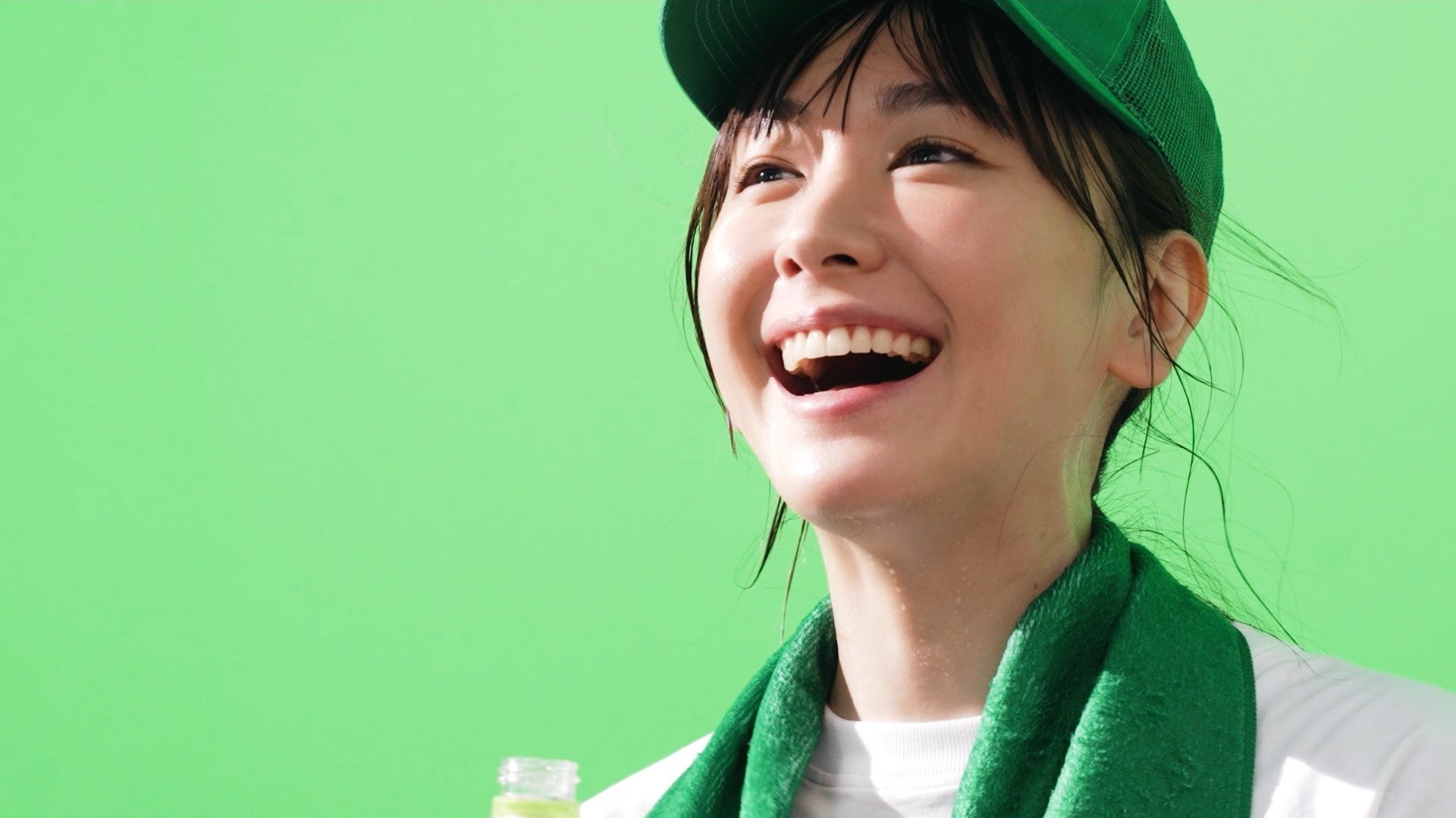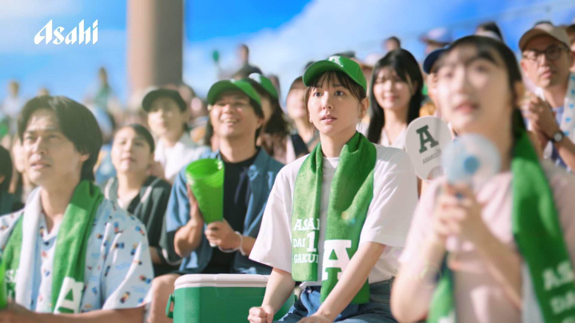 続いて、CMの撮影では、野球帽のほか、今回のために特注で作られた緑のマフラータオルも登場。新垣も首にかけ、緑のメガホンを手にしながら、大勢の観戦者たちと一緒に楽しげに応援するシーンから撮影スタート。元気な声とともに、ボトルを高く掲げる新垣。周りの観客たちはそんな新垣を、野球の応援そっちのけで熱烈に応援するが、その様子を見て「どうも」と少し照れる表情がとてもキュートな撮影となった。