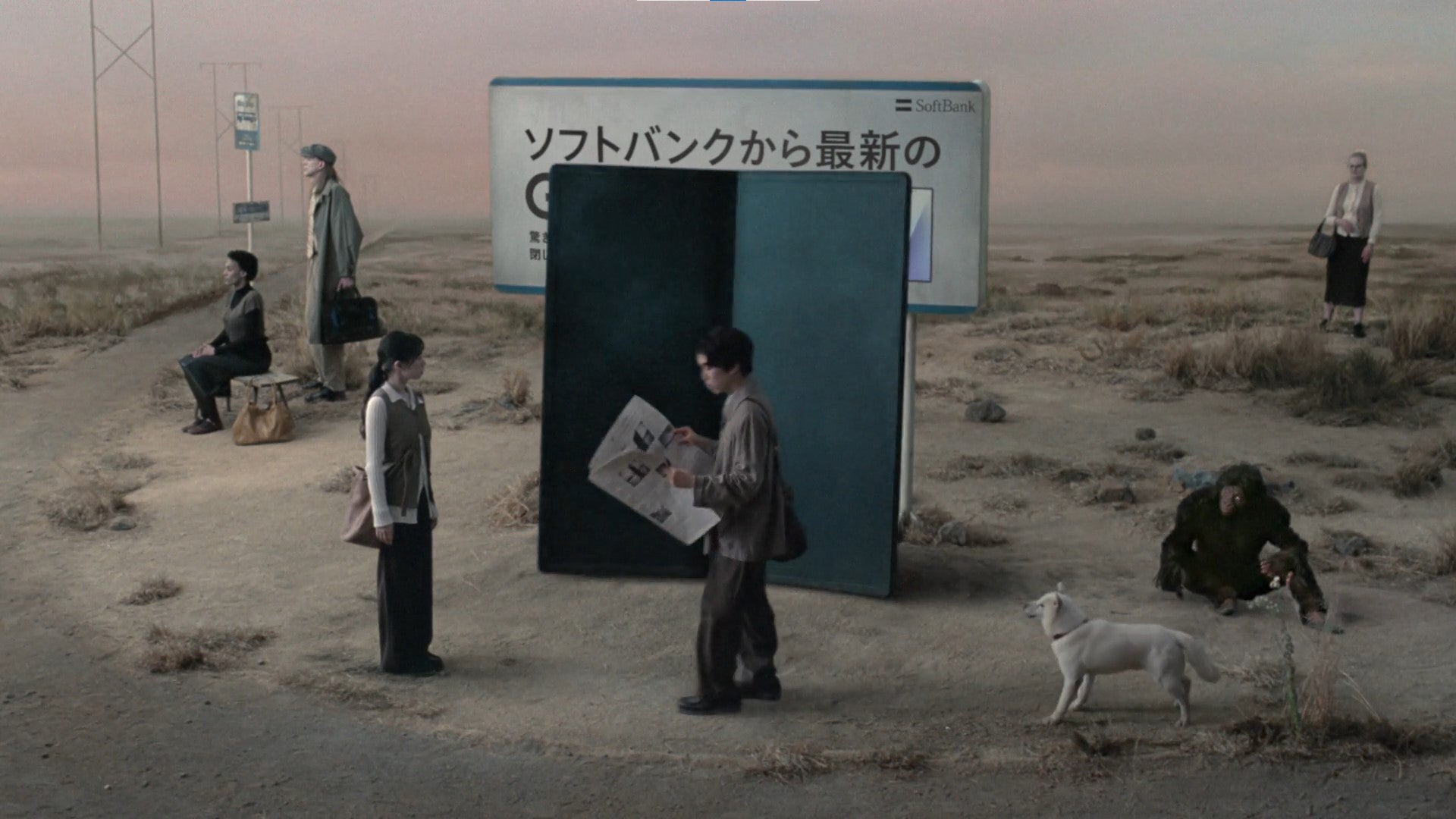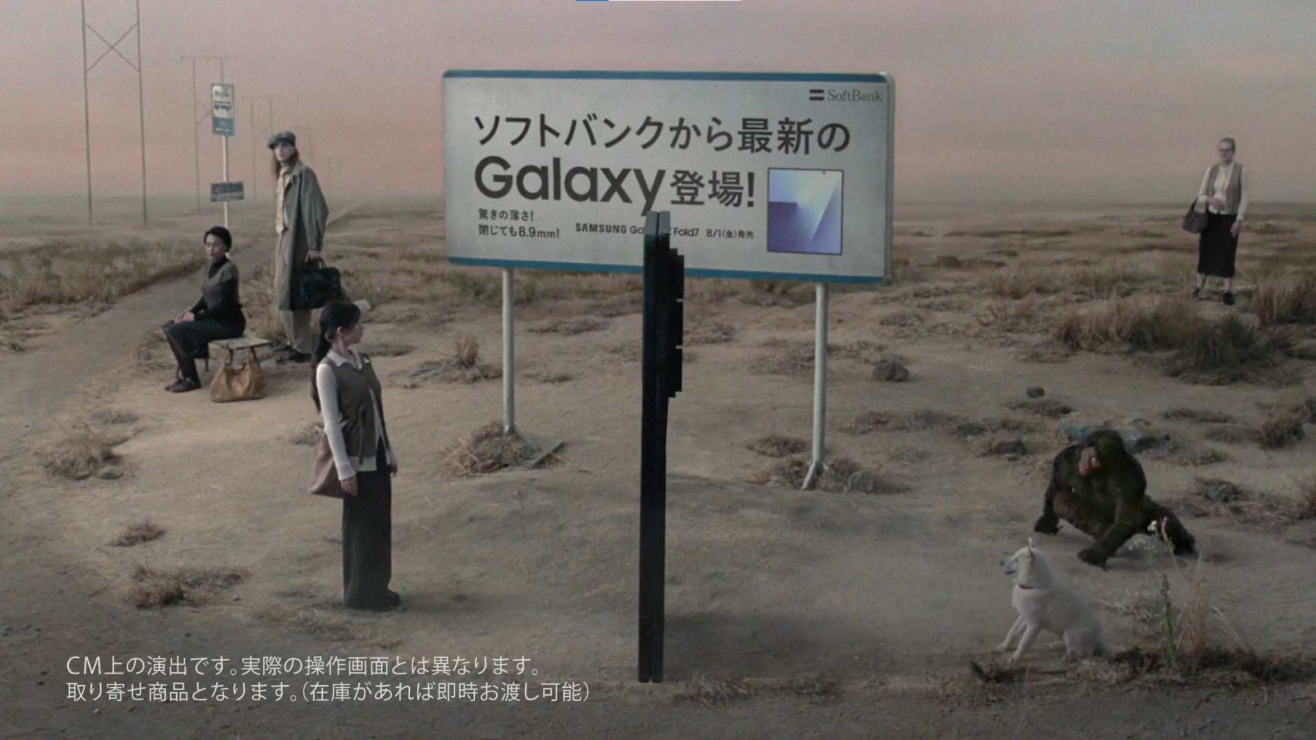 新テレビ CM「未確認物体との遭遇」篇では、新聞を読みながら歩いてきた坂東が、突如として“極薄”の謎の物体に挟まれてしまい、その中を歩き続けるという不思議な世界観の演出を通して、折りたたんでも薄い最新のGalaxyが“ソフトバンク”から登場したことを紹介している。一方、「未確認物体との共存」篇では、川崎がその“極薄”の物体を折りたたむ様子や、マルチタスクを表す演出によって、最新モデルの魅力を表現している。