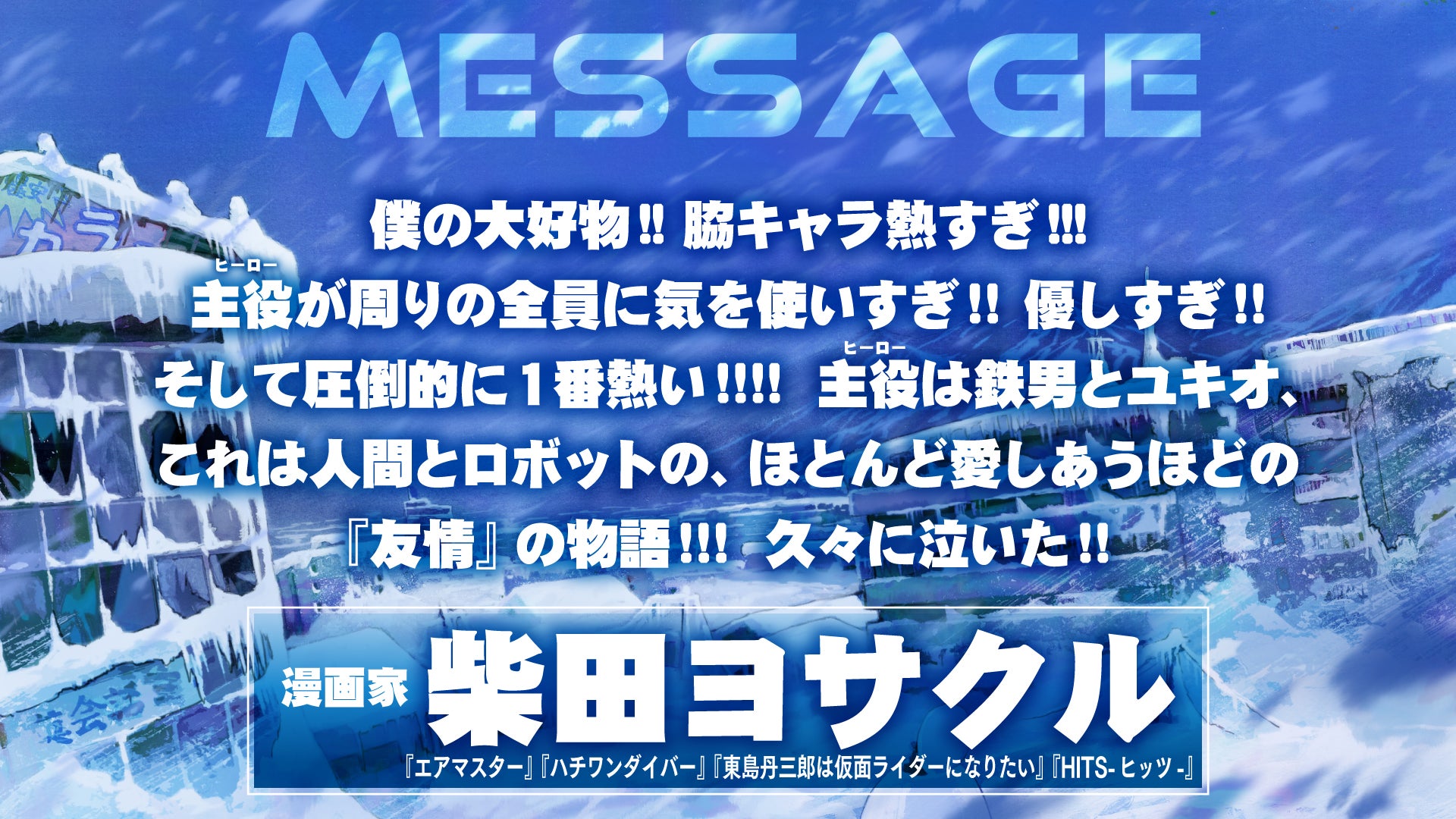動き出す物語が好きです。絶望の中にあっても動き出す人。動き出す運命。『スノウボールアース』がワクワクするのは、そんなふうに動き出して抗うキャラクターたちがカッコいいからだと思います。主人公・流鏑馬鉄男もまた、自らの殻を破ろうと動き出し、熱い物語が動き出します。ぜひ楽しみにしていてください!