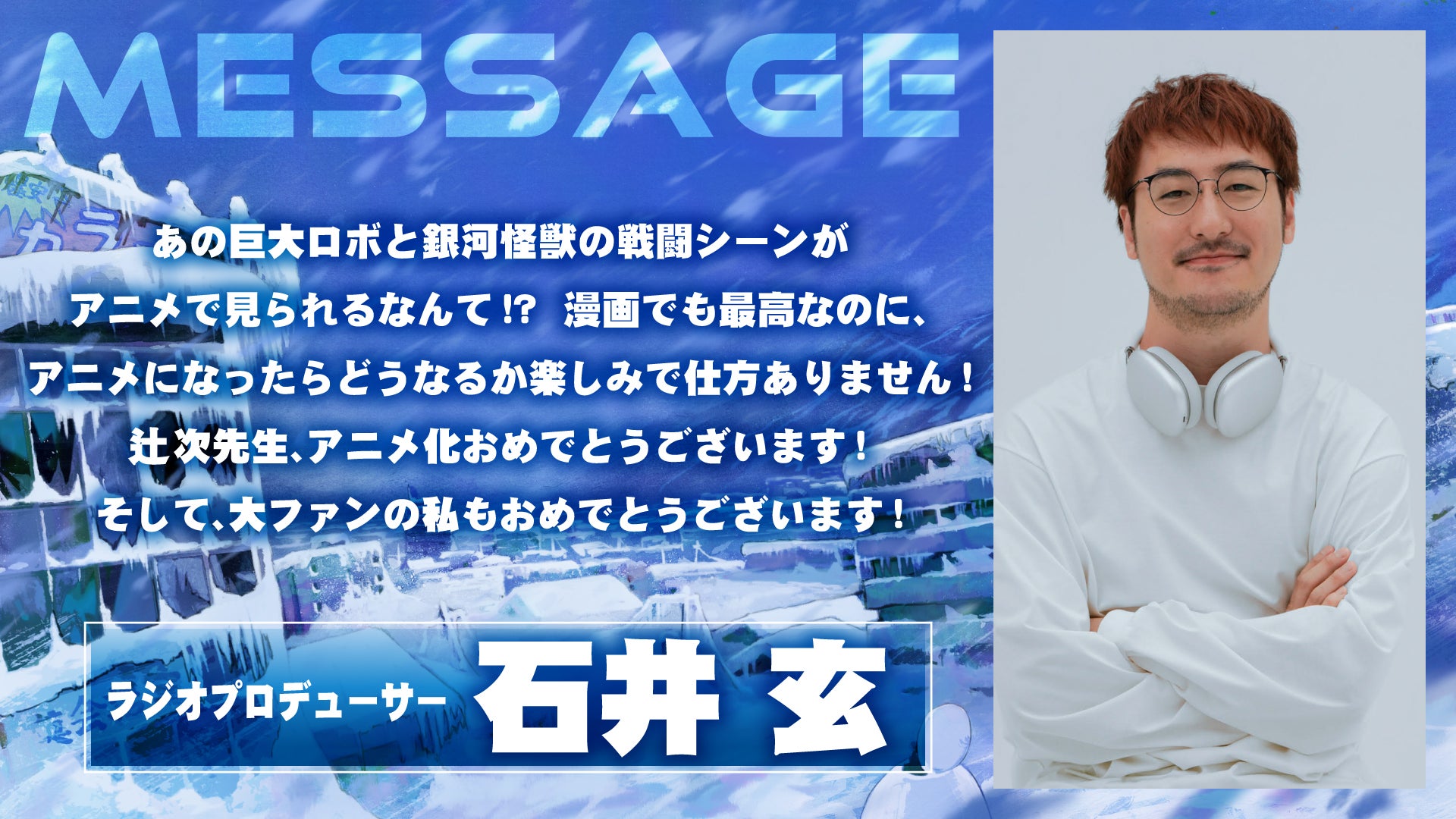解禁となったスーパーティザービジュアルは、キャラクターデザインを務める河野氏が描き下ろし。さらに、原作・辻次夕日郎氏によるアニメ化を記念する特別な描き下ろしイラストとコメントも公開。アニメ化に伴い、各界の著名人からコメントも到着した。
