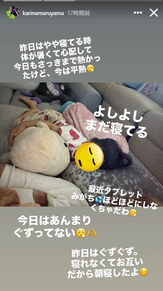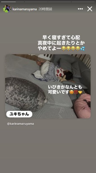 丸山は「早めに寝たよ、大丈夫かなぁ。起きそう…朝まで寝ますように」と綴り、長女が大きなゴマアザラシのぬいぐるみと並んで寝ている後ろ姿の写真を公開。投稿には「#イヤイヤ期真っ只中」「#ママあっちいって」「#ママだめだよ」「#口癖笑」「#可愛すぎて困る」のハッシュタグが添えられ、大変な子育てながらも楽しんでいる様子が垣間見える。また、同時にストーリーズも更新し投稿と同じ写真に「早く寝すぎて心配真夜中に起きたりとかやめてよー」「いびきがなんとも可愛いです」と書き込み、その後再びストーリーズにて長女がゴマアザラシのぬいぐるみを枕にして寝ている姿を公開して「よしよしまだ寝てる」と報告している。