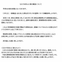 関係者の皆様、応援して下さっている皆様に御心配をおかけすることとなり、心よりお詫び申し上げます。なかやま本人は今後も変わらず仕事に邁進する所存です。
