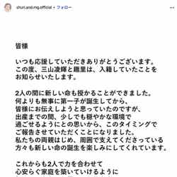 2人は直筆の署名が入った文書にて「この度、三山凌輝と趣里は、入籍していたことをお知らせいたします」と報告。「2人の間に新しい命も授かることができました」と趣里の妊娠も発表し、「何よりも無事に第一子が誕生してから、皆様にお伝えしようと思っていたのですが、出産までの間、少しでも穏やかな環境で過ごせるようにとの思いから、このタイミングでご報告させていただくことになりました」と経緯を説明した。「私たちの両親はじめ、周囲で支えてくださっている方々も新しい命の誕生を楽しみにしてくれています」とし「これからも2人で力を合わせて心安らぐ家庭を築いていけるように努めていきたいと思っております。温かく見守っていただけたら幸いです」と呼びかけた。