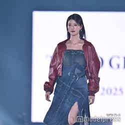 デニムジャケットをアレンジしたようなベアトップのワンピースに赤いレザージャケットを羽織り、ランウェイに降臨した生見。前髪を流したヘアスタイルで、クールなオーラで会場を圧倒。スリットからはほっそりとした美しい脚をのぞかせた。「TGC 2025 A/W」テーマは「BEYOND TOGETHER」