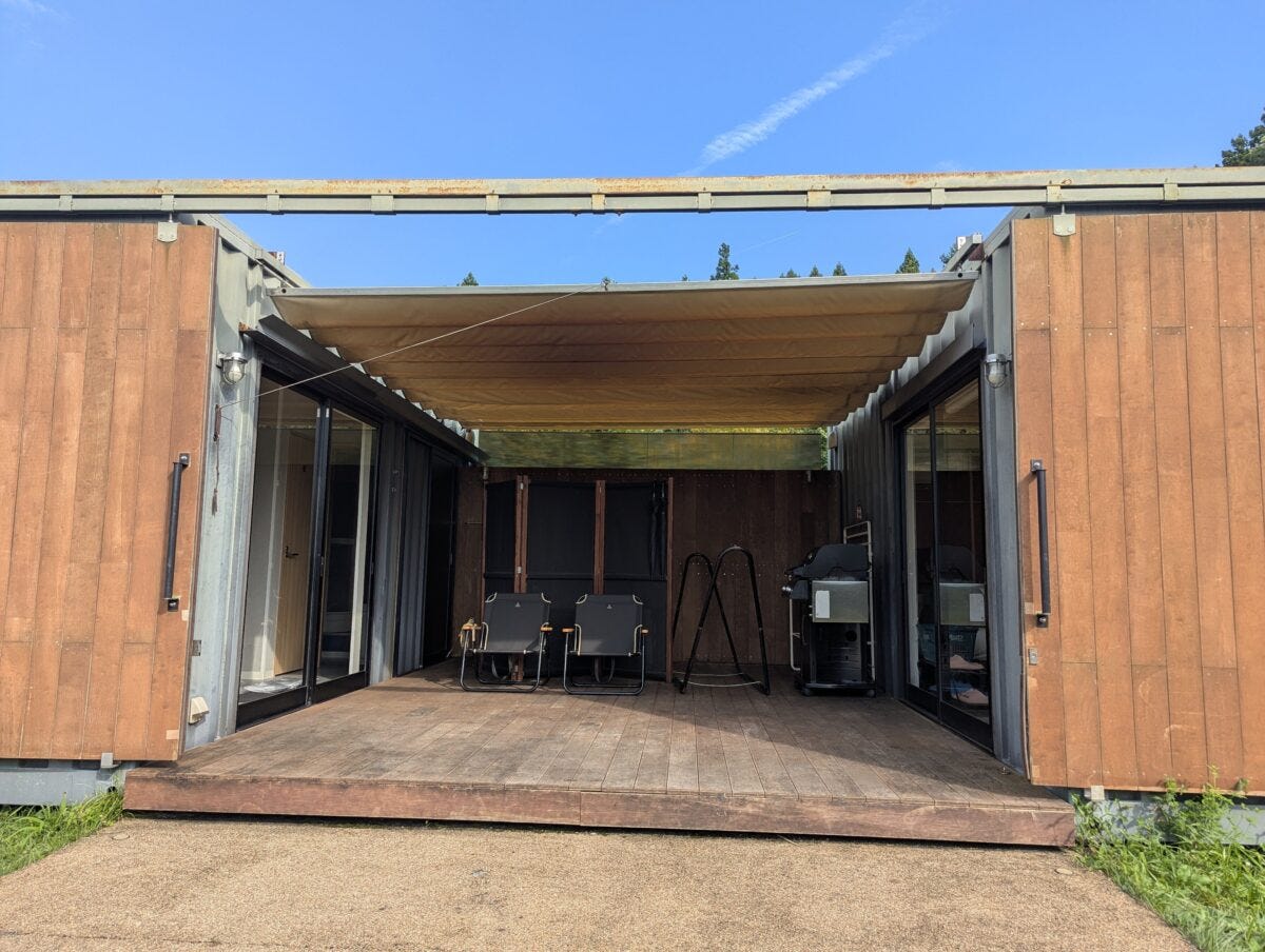 藤乃煌の部屋タイプはラグジュアリーな藤乃スイートや、他のグランピング施設でも定番のドームテント、愛犬と泊まれるDOGキャビンなどさまざまだが、筆者が宿泊したグランデキャビンは大型のコンテナのようなビジュアルで、秘密基地のようなワクワク感が泊まる前からたまらなかった。
