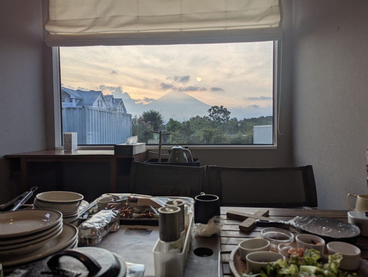 ちなみに、焼く以外の準備はほぼスタッフが行ってくれるのあが、ダイニングに料理を並べているときに夕暮の富士山が見られたことにはちょっと感動した。