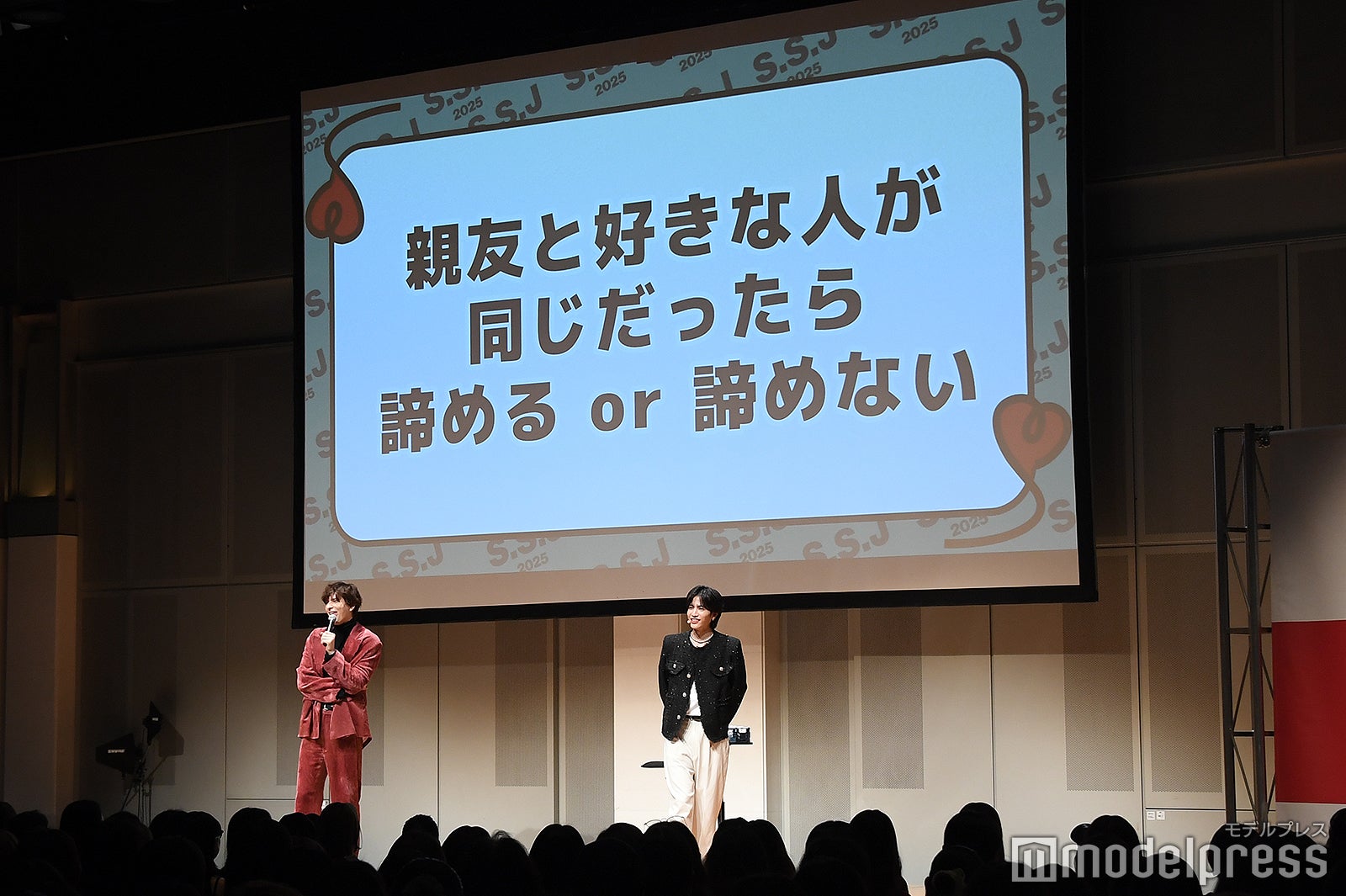 会場の期待が最高潮に達した瞬間、城田が颯爽と登場。志尊との久しぶりの公の場での共演に、ひときわ大きな拍手が巻き起こった。「最強の刺客としてご紹介いただきました、城田優です。よろしくお願いします!」とユーモアを交えて自己紹介すると、客席を見渡しながら「登場のプレッシャーがハンパない(笑)。佐藤健くんかな?町田啓太くんかな?ってハードルが上がってる」と笑いを誘った。今回の登場は、自身の30歳のイベントに志尊がサプライズ出演してくれたことへの“お返し”だと明かし、冒頭から2人の強い絆がにじむエピソードに、再び温かな拍手が送られた。和やかな雰囲気の中で発表されたのは、特別企画「ガチンコディベート対決」。テーマは「親友と好きな人が同じだったら、諦める?諦めない?」という、2人にしかできない“友情試し”とも言えるお題だ。事前の打ち合わせなしで挑む本気のトークバトルでは、志尊が“親友を優先して諦める派”、城田が“好きな人を諦めない派”として、それぞれの立場を熱弁。一方で、城田は「淳ちゃんと同じ人を好きになったら諦めるよ」と本音をこぼし、最後に「いつもの俺なら、絶対に諦める!」という言葉に、志尊も「俺も優となら普通に諦める」と応じた。笑いを交えつつも“親友最強”の絆を改めて示し、熱戦は城田の勝利で幕を閉じた。