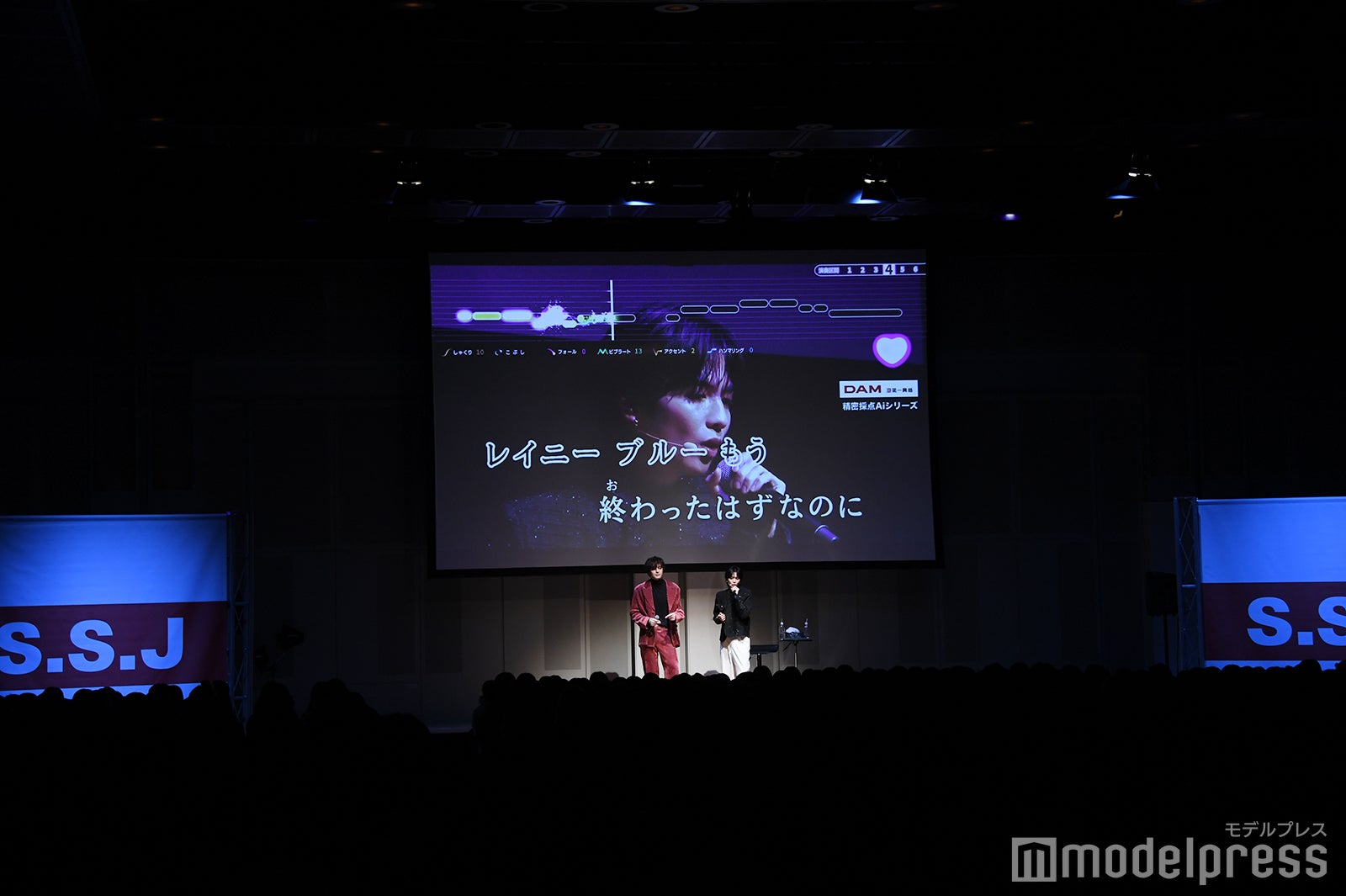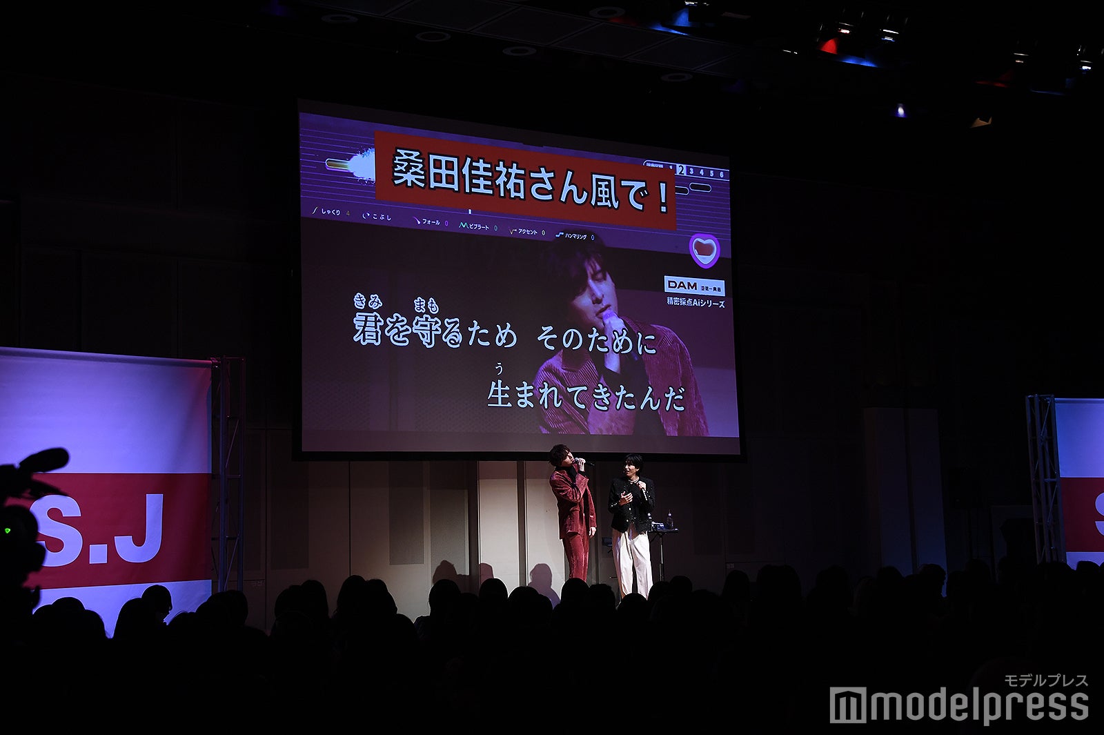 続いて、来場者プレゼント獲得をかけた「ムチャぶりカラオケ」に挑戦。SMAPの「らいおんハート」を歌いながら、モニターに表示される「桑田佳祐さん風で!」「タラちゃん風に!」などのムチャぶりに応えつつ、95点以上の高得点を目指すも、モノマネに夢中で初回は87点と惜しくもクリアならず。気持ちを切り替えた2人は目標を90点に下げて再挑戦。真剣勝負となった2回戦では、徳永英明の「レイニーブルー」を披露し、見事93点を獲得した。