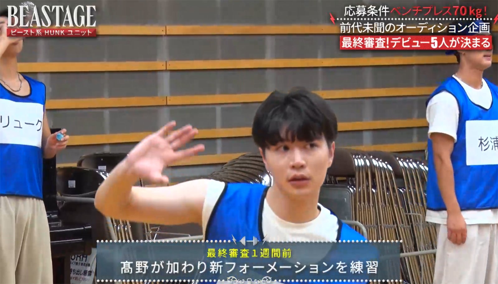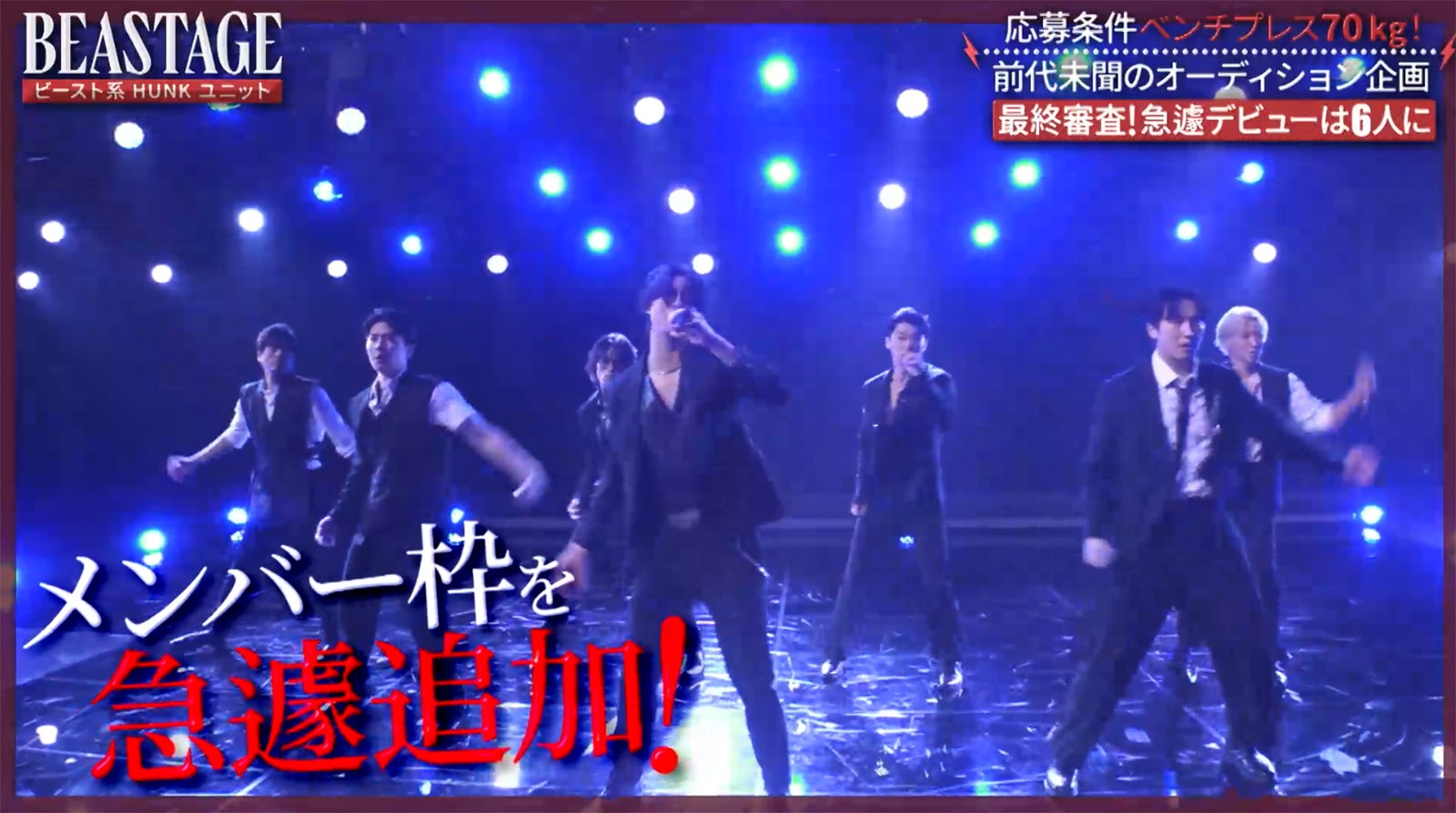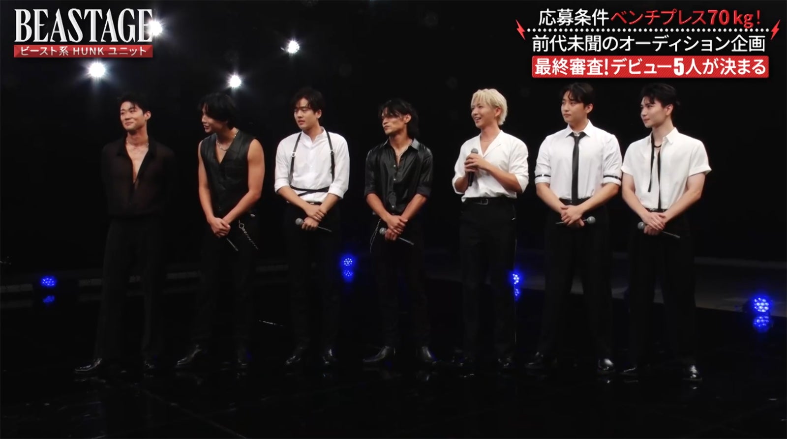 同番組では、株式会社Mama&Sonが主催する同社初の男性ユニットオーディション「BEASTAGE(ビーステージ)プロジェクト」に独占密着。選考の過程から、野性味あふれる“ビースト系”ボーイズユニット誕生までの軌跡を追う。このオーディションでは“HUNK”をコンセプトに掲げ、「Heart-warming(心温まる)」、「Ultimate(究極の)」、「Noble(気高い)」、「Kinniku (筋肉)」という4つの要素を兼ね備えた唯一無二のパフォーマンスユニットを発掘・育成。また、合宿期間中にベンチプレス 70kg以上達成することがミッションとして課されている。そして、オーディション参加者はグループとしてのメジャーレーベルデビューを目指す。1週間の強化合宿、韓国での武者修行を経て7人に絞られたメンバーたち。韓国では、韓国俳優歴16年のコ・テジンが途中参加し、最終審査を前に元AKB48西野未姫の弟である西野成真、玉木雅也が辞退。2人の辞退を受け、二次審査で脱落した「PRODUCE 101 JAPAN」元練習生・高野慧(※「高」は正式には「はしごだか」)が繰り上げで、復活を果たし、7人が最終審査に進んだ。