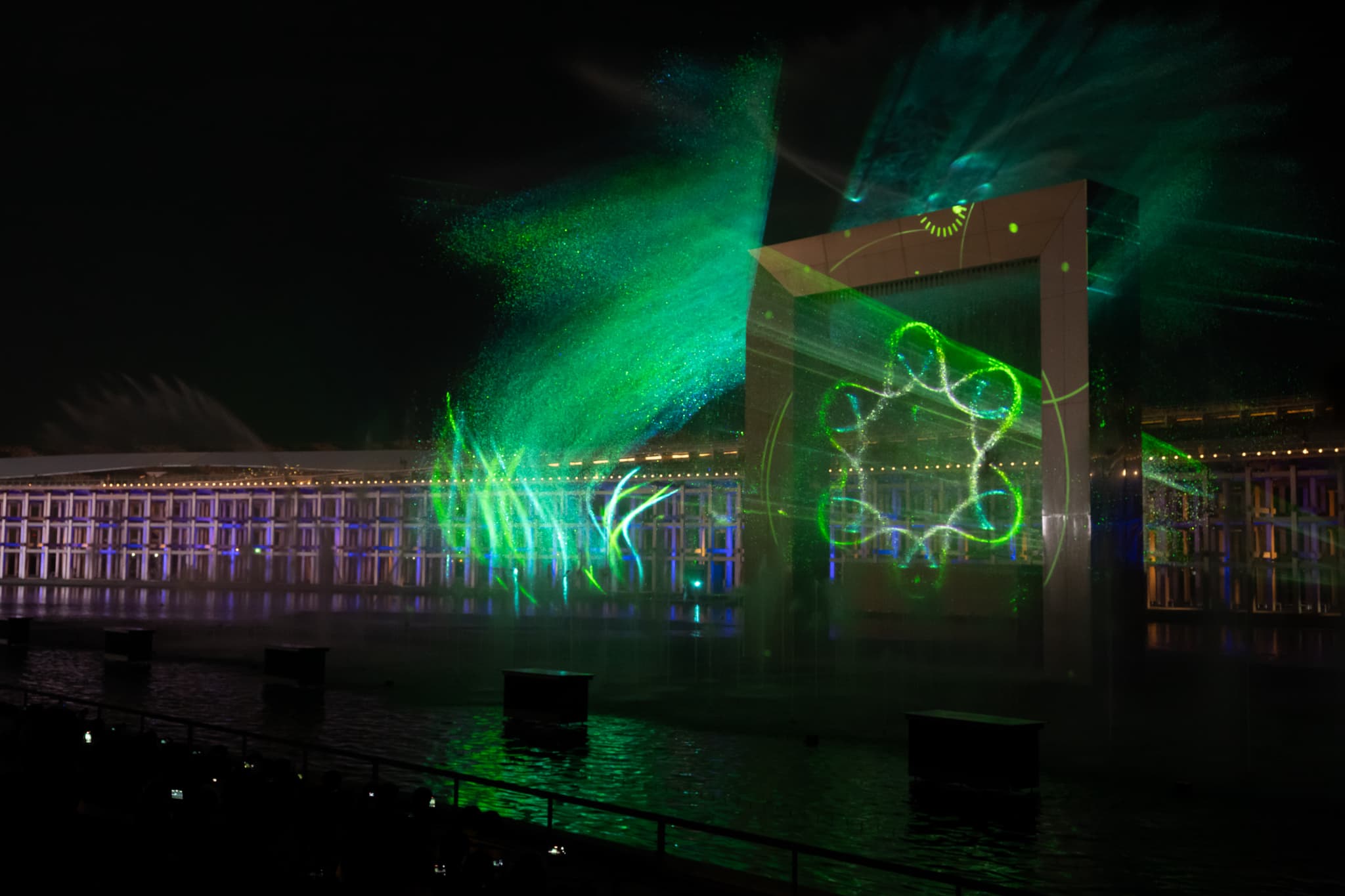 噴水装置の数はおよそ300基。水のスクリーンを生み出す中央の巨大オブジェは高さ18mにもおよび、常設かつ毎日開催される水上ショーとしては万博史上最大規模なのだとか!(※ショー実施エリア面積が最大)