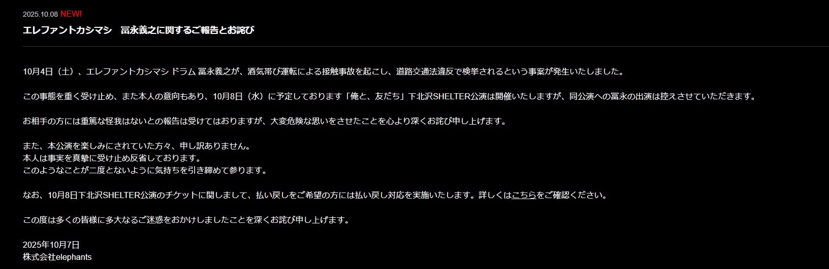 公式サイトは「10月4日(土)、エレファントカシマシ ドラム 冨永義之が、酒気帯び運転による接触事故を起こし、道路交通法違反で検挙されるという事案が発生いたしました」と報告。「この事態を重く受け止め、また本人の意向もあり、10月8日(水)に予定しております『俺と、友だち』下北沢SHELTER公演は開催いたしますが、同公演への冨永の出演は控えさせていただきます」とライブへの出演を控えると発表した。続けて「お相手の方には重篤な怪我はないとの報告は受けてはおりますが、大変危険な思いをさせたことを心より深くお詫び申し上げます」と謝罪。また「本公演を楽しみにされていた方々、申し訳ありません。本人は事実を真摯に受け止め反省しております。このようなことが二度とないように気持ちを引き締めて参ります」と伝え、10月8日下北沢SHELTER公演のチケットについて、希望者には払い戻し対応を実施するとしている。