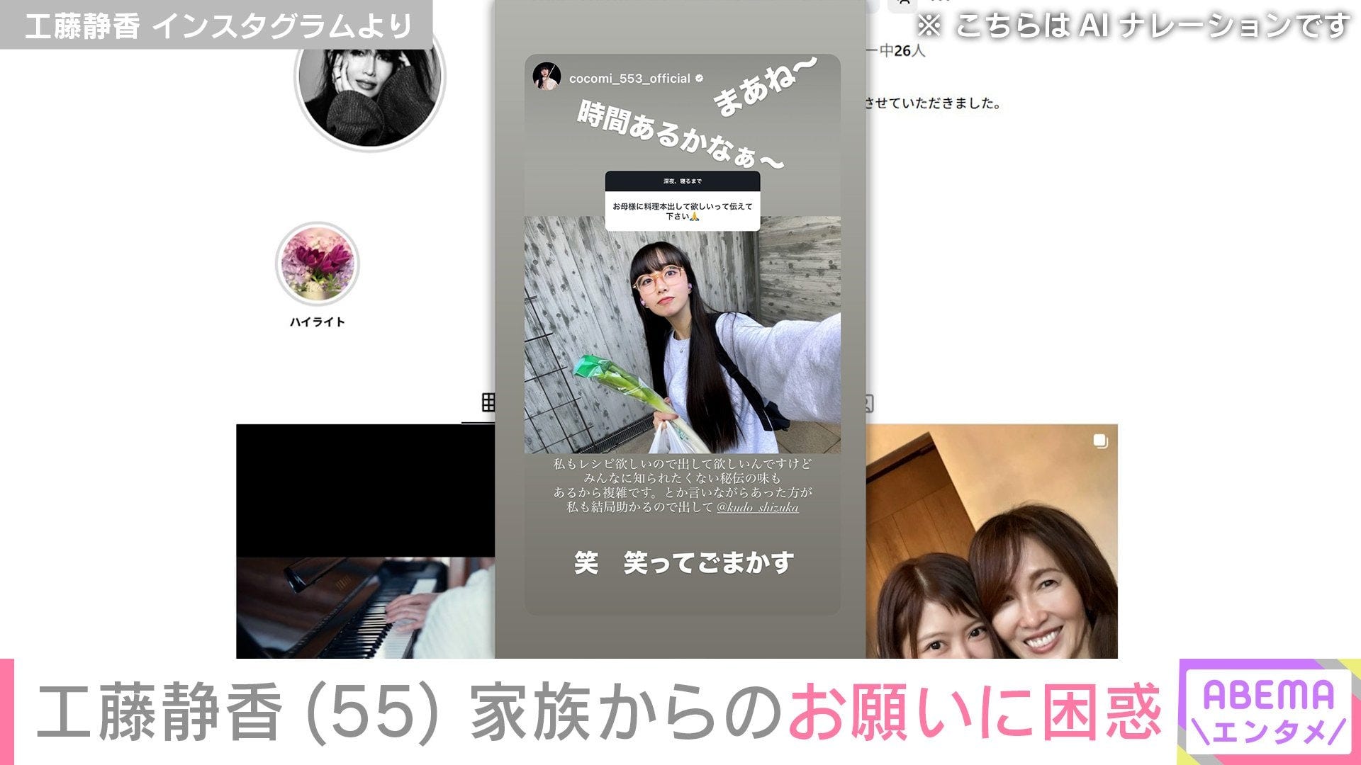 2025年10月9日、Instagramのストーリーズで「お母様に料理本だして欲しいって伝えてください」というファンから寄せられたお願いに、Cocomiが回答。Cocomiは「私もレシピ欲しいので出して欲しいんですけど、みんなに知られたくない秘伝の味もあるから複雑です。とか言いながらあった方が私も結局助かるので出して」と返答した。