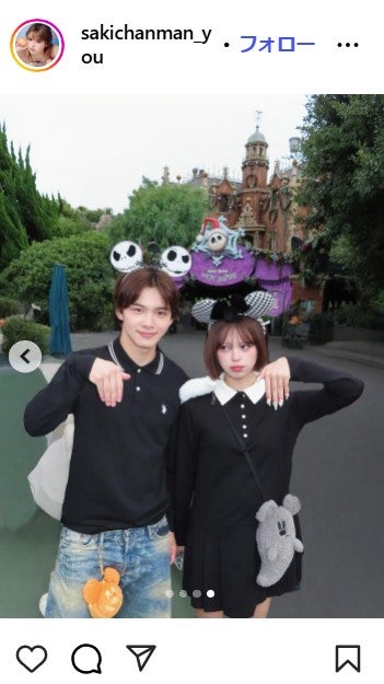 おさきは「#Dハロ」とハッシュタグを添え「ずっとつけたかったカチューシャつけれた かわいすぎない??????」と千鳥格子柄の耳付きカチューシャをつけ、スラリと真っ直ぐに伸びた美しい脚が際立つ、白襟の黒いミニワンピース姿を披露した。さらに、次の投稿では「弟とディズニー」とコメントし、ABEMAの高校生による青春恋愛リアリティーショー「今日、好きになりました。」(毎週月曜21時~)に参加していた弟・今井暖大との2ショットを複数枚公開。今井も黒のポロシャツを着用し、きょうだいで黒で揃えたリンクコーデを披露した。