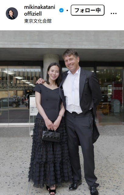 中谷は「極上の音楽を聴きに、ぜひお出かけくださいませ」とつづり、ティロ氏が12月9日に東京オペラシティで開催されるコンサート「フィルハーモニクス ウィーン=ベルリン 2025」に出演することを報告。投稿では、タキシード姿のティロ氏が黒のトップスにロングスカートを合わせた上品なコーディネートの中谷の肩を抱き、2人でカメラに向かって穏やかに微笑んでいる写真を公開している。中谷美紀の投稿に反響