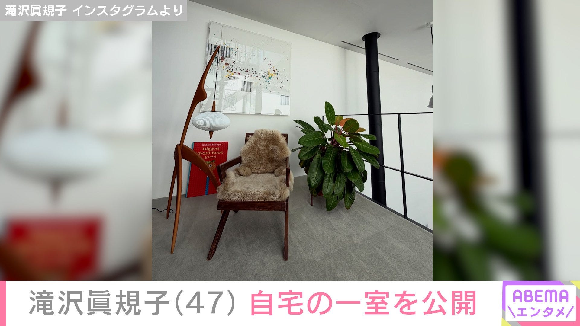 モデルの滝沢眞規子(47)が17日、Instagramを更新。大きな絵や観葉植物が置かれた自宅を披露した。