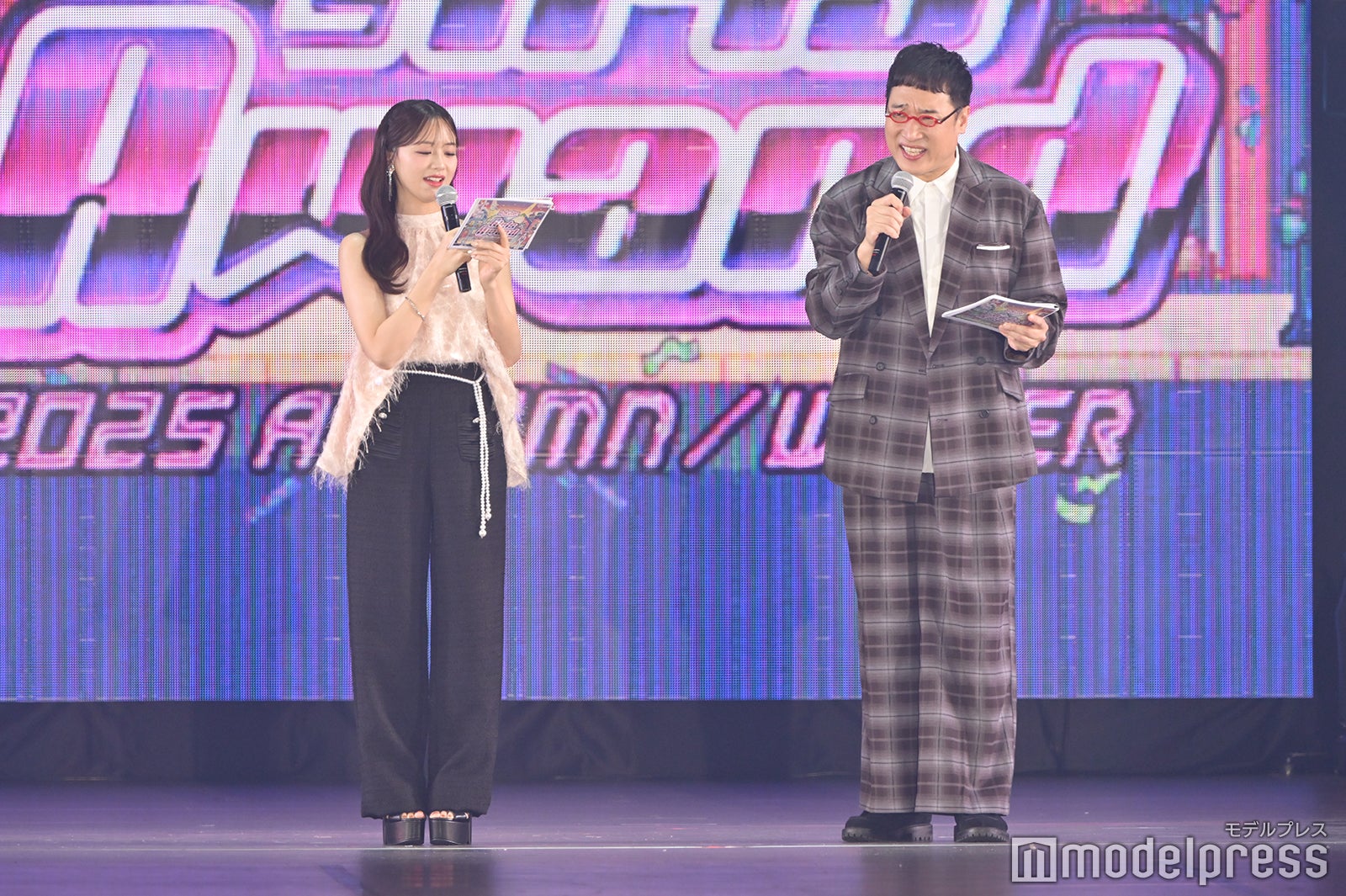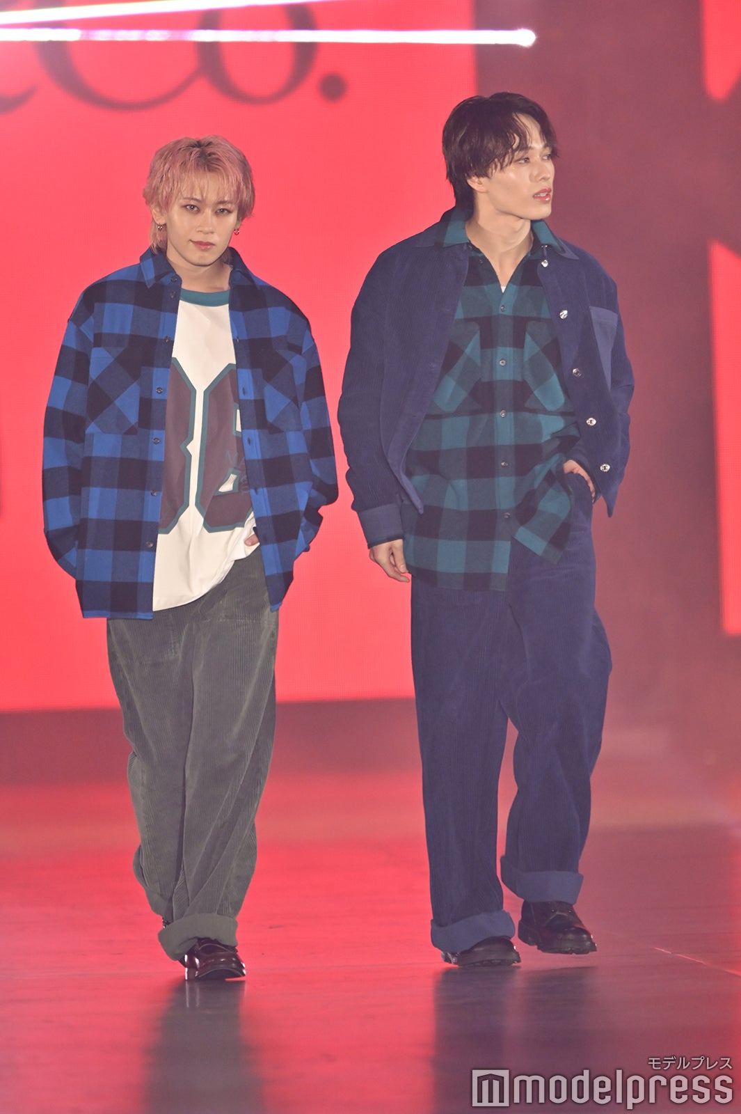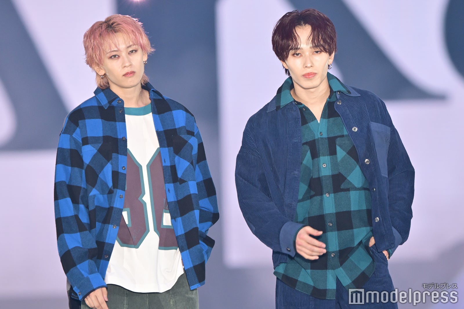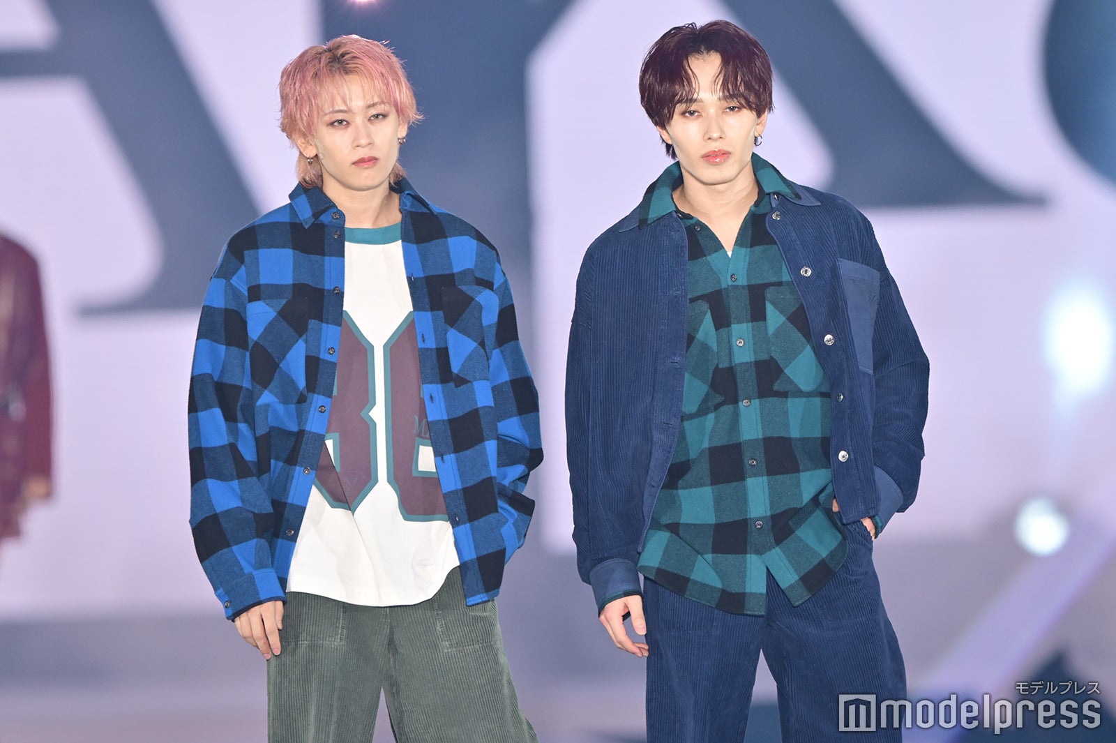 ブルーとグリーンのチェックシャツをお揃いでまとって登場した2人。秋らしいコーデュロイ素材をアクセントに、クールなポージングを決めた。「ガルアワ2025 A/W」テーマは「Dress Up My Style -Play the game of You-」