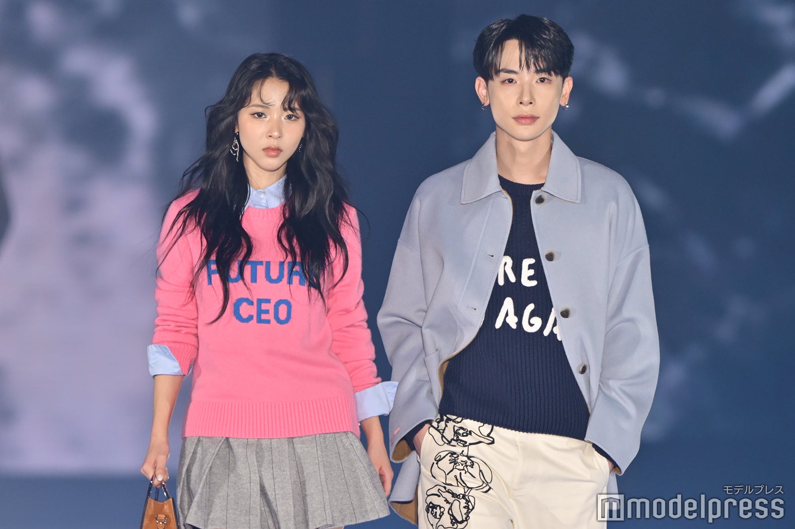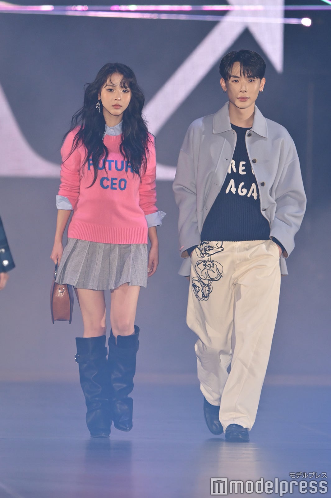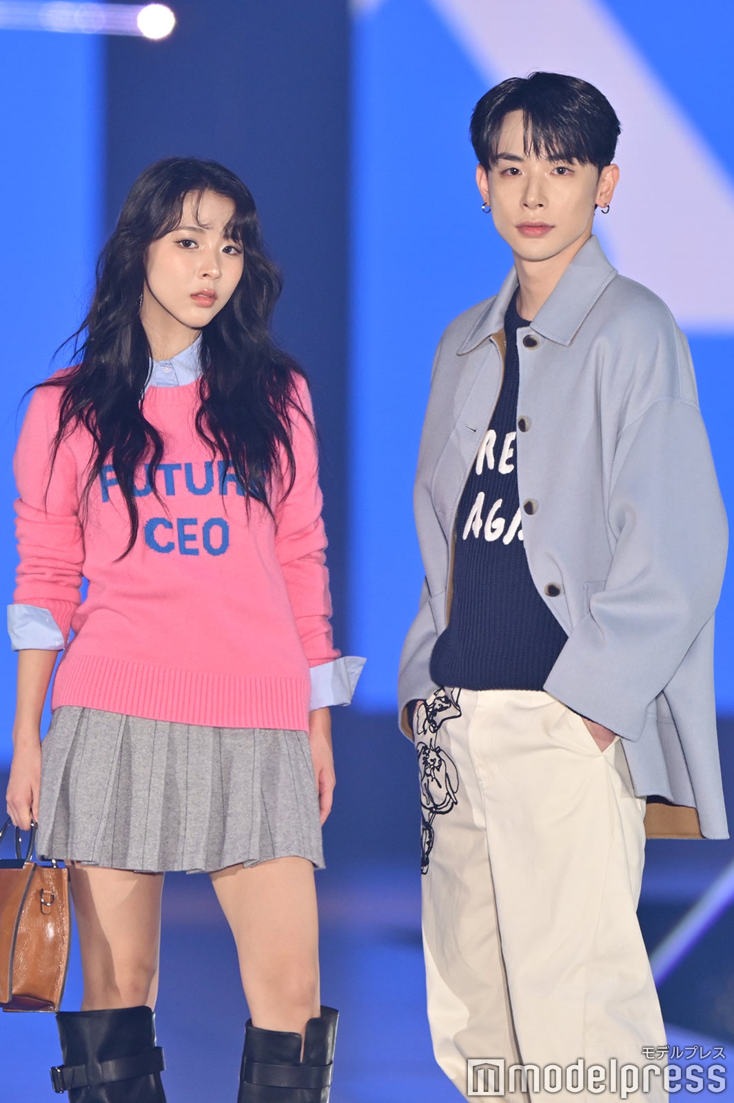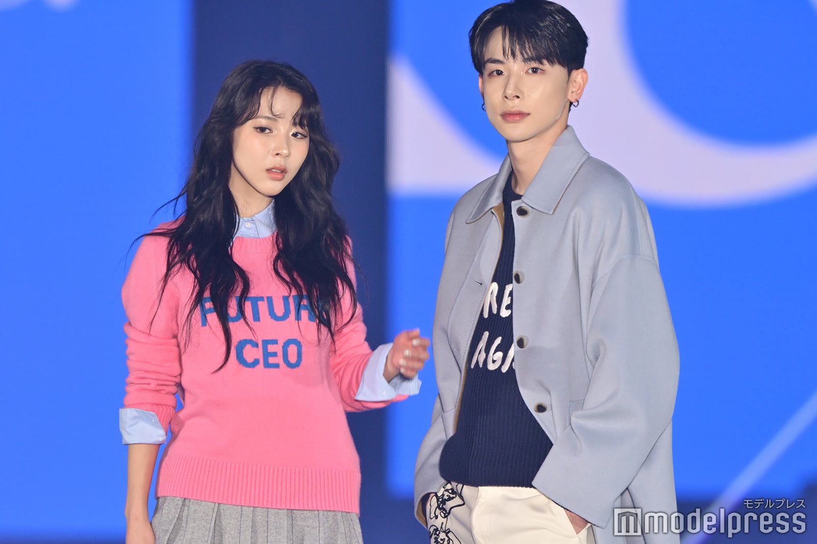 ブルーとグリーンのチェックシャツをお揃いでまとって登場した2人。秋らしいコーデュロイ素材をアクセントに、クールなポージングを決めた。「ガルアワ2025 A/W」テーマは「Dress Up My Style -Play the game of You-」