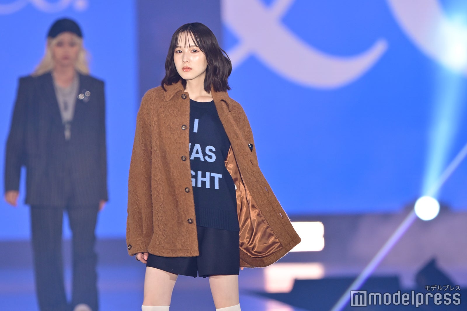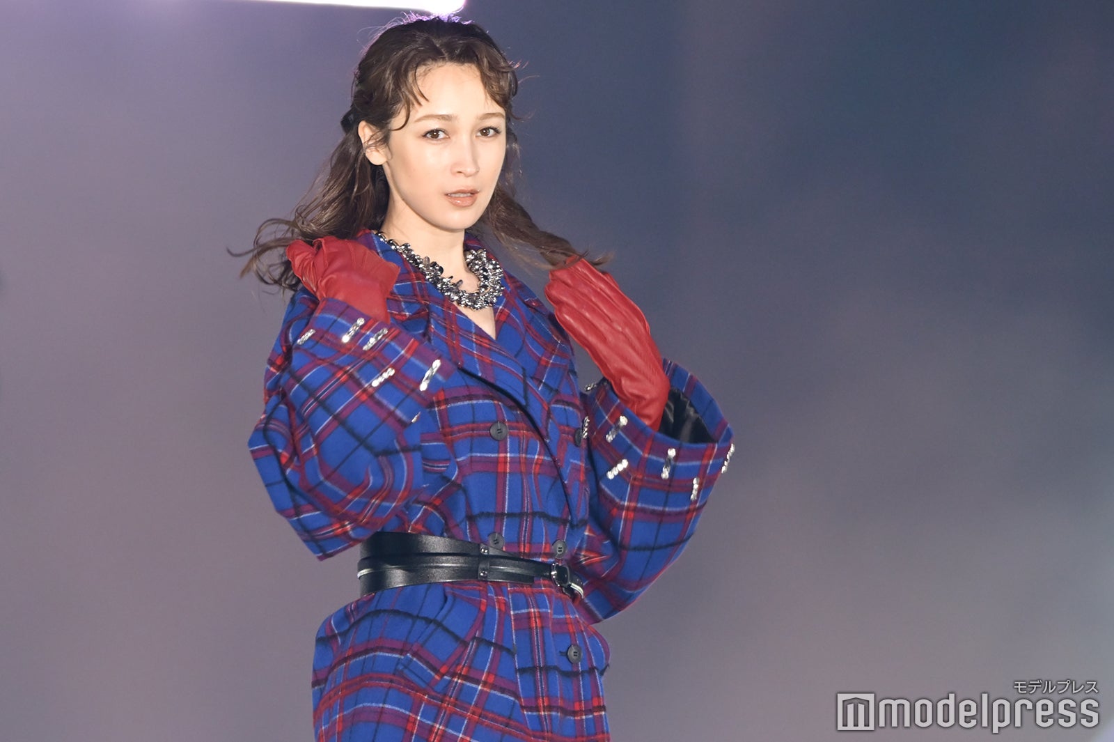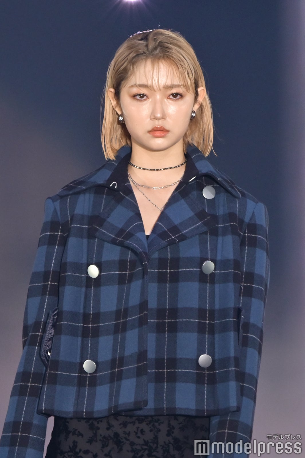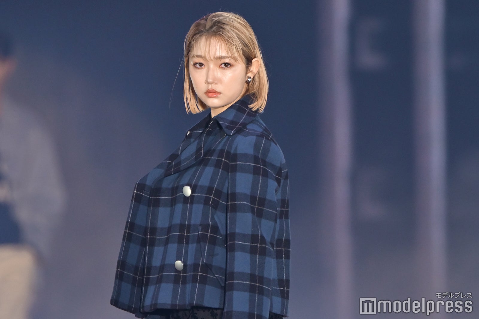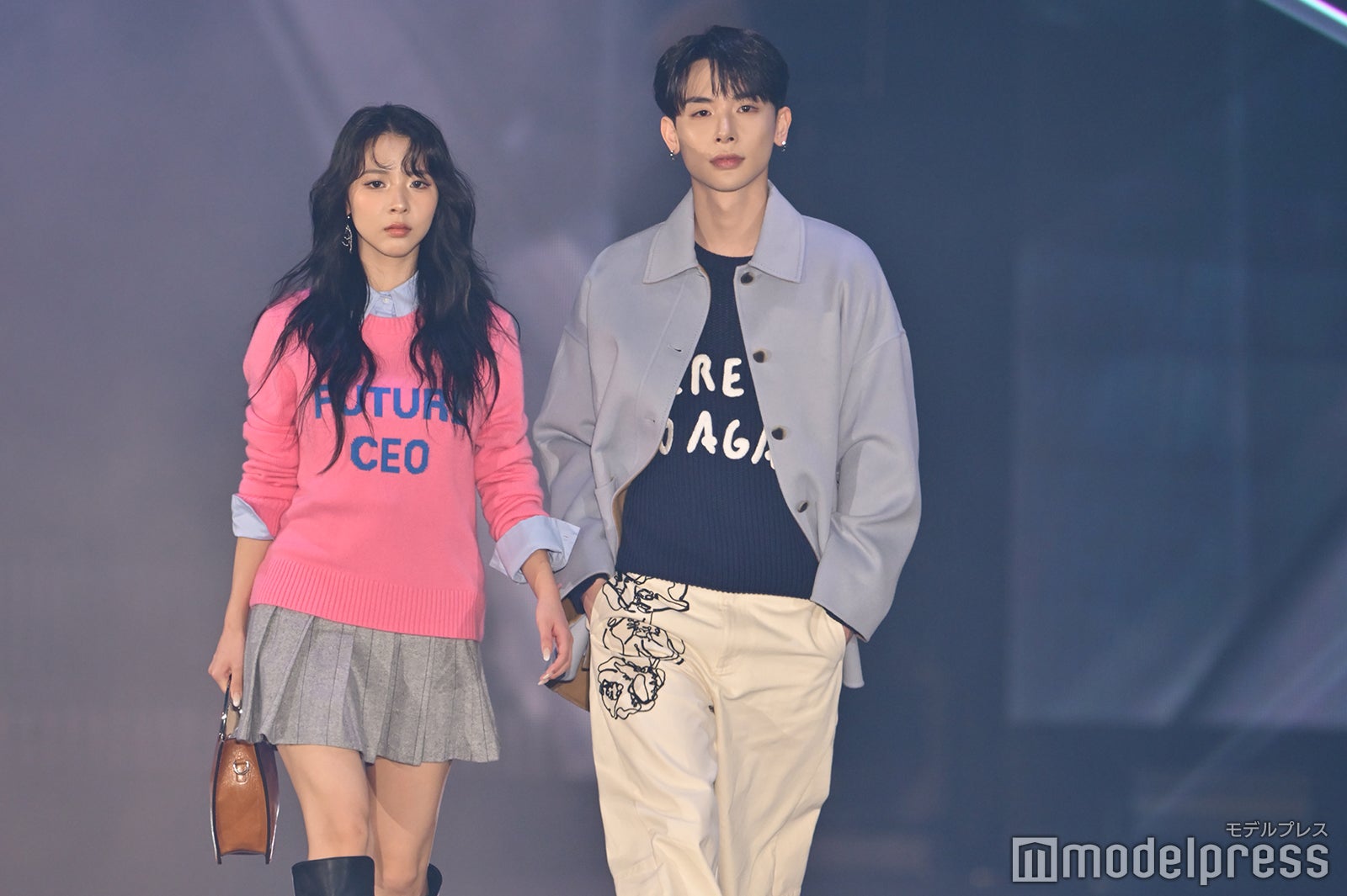 ブルーとグリーンのチェックシャツをお揃いでまとって登場した2人。秋らしいコーデュロイ素材をアクセントに、クールなポージングを決めた。「ガルアワ2025 A/W」テーマは「Dress Up My Style -Play the game of You-」