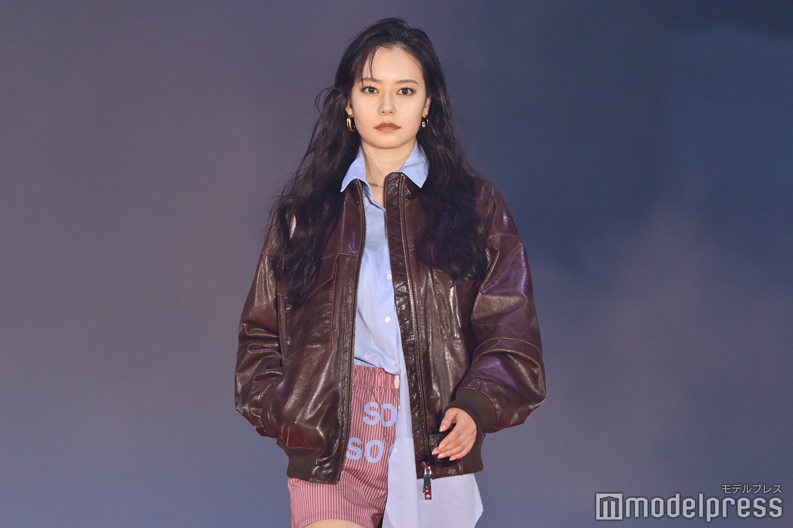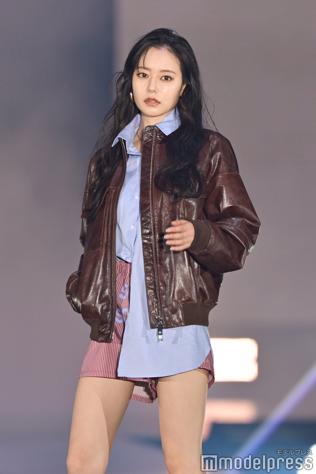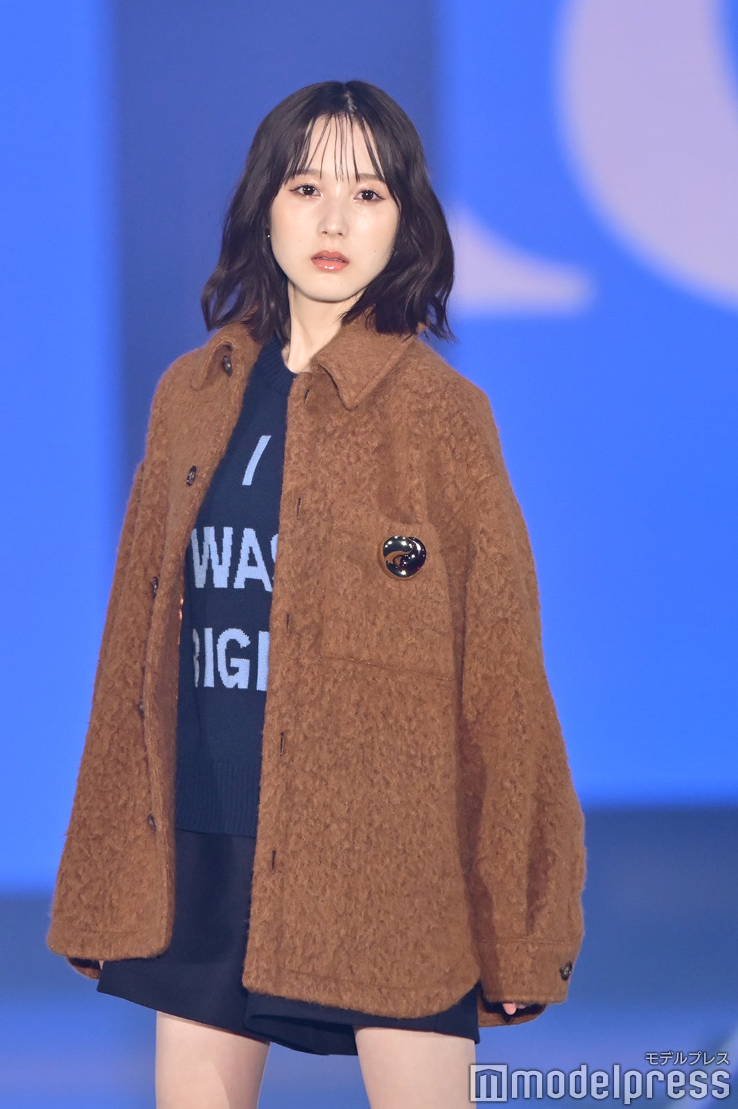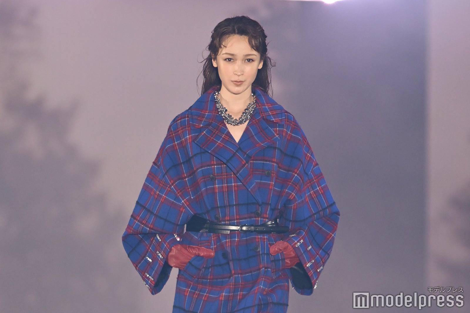 ブルーとグリーンのチェックシャツをお揃いでまとって登場した2人。秋らしいコーデュロイ素材をアクセントに、クールなポージングを決めた。「ガルアワ2025 A/W」テーマは「Dress Up My Style -Play the game of You-」
