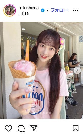 音嶋は「国際通り行けた」と沖縄でのストリートショットなどを投稿。アイスを片手に、ハイビスカスの花を髪に飾り微笑んでいるショットや、沖縄のオリオンビールのロゴが書かれたピンクのTシャツに、ペールピンクのガーリーなショートパンツ姿で道でポーズをとるショットも披露。ボトムスからは素肌が輝くスラリと伸びた美しい脚を見せている。音嶋莉沙の投稿に反響
